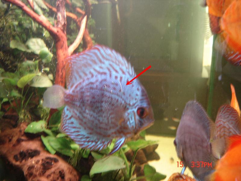 Εδώ και δύο μέρες αυτό το θηρίο σταμάτισε να τρώει και κρύβεται.Παρατήρησα στη μία μεριά του,τέσσερα...σκουλικάκια ή κάτι τέτοιο,το ένα πολύ μεγαλύτερο απ'τα άλλα.Μετά 2 ώρες ''αυτά'' εξαφανίστηκαν και το ψάρι άρχισε να κυκλοφορεί δειλά δειλά αλλά ακόμη δεν έφαγε