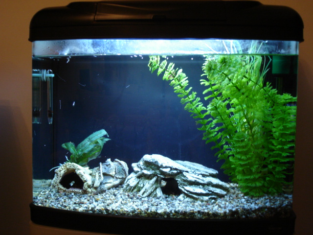 Έχω ένα τροπικό ενυδρείο 60-65lt με πέτρες στον πάτω, γύρο στα 5-7 εκατοστά, μία γέφυρα, μία σπυλιά και 2 πλαστικά φυτά.