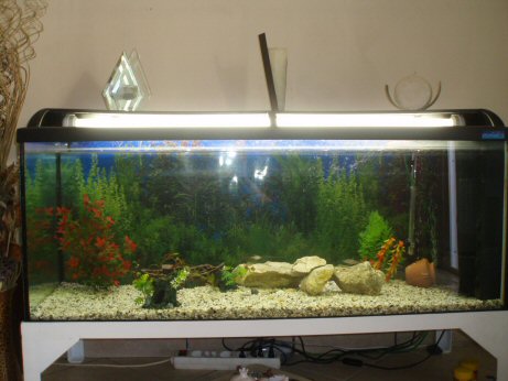 Διαστάσεις: 120x40x50 Όγκος: 220lt Κατηγορία: Κοινωνικό Φυτά: 2 ψέυτικα Ψάρια / ¶λλα είδη: 2 ασημένιους καρχαρίες, 4 Tanichthys albonubes,ένα ασημένιο δολάριο και ενα Cryptoheros nigrofasciatus Διακοσμητικά υλικά: χαλίκι, 4 πέτρες απο λατομείο, 1 μικρό κιούπι, διακοσμικά ( καραβάκι,μικροί κορμοί ψεύτικοι) (χαλίκι, ξύλα κ.λ.π.) Φόντο: αφίσα με φυτά Φωτισμός: 2 λαμπες Φθωρίου( δεν έχω στοιχεία) Διάρκεια φωτισμού: 5 ώρες την ημέρα περίπου Φιλτράρισμα: μαμά φίλτρο Θερμοστάτης: 27 βαθμούς Λίπανση: - Παροχή CO2: - Παράμετροι: pH: - Γενική σκληρότητα (GH): - Ανθρακική σκληρότητα (ΚΗ): - Αμμωνία (ΝΗ3): - Νιτρώδη (ΝΟ2): - Νιτρικά (ΝΟ3): - Αλλαγές νερού: κάθε μήνα 100 lt Θερμοκρασία: 27 βαθμοί ¶λλες πληροφορίες: - Φωτογραφία: |