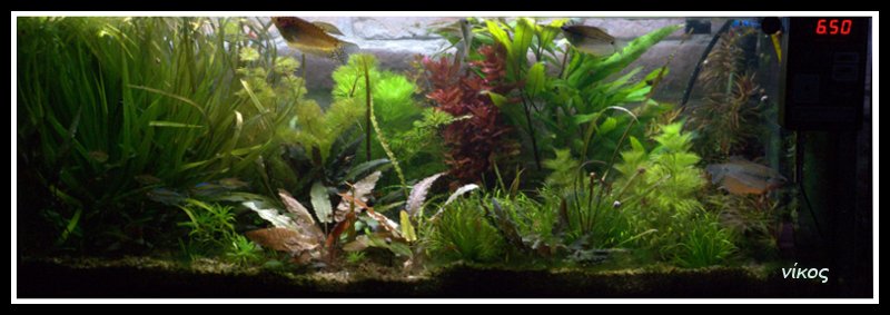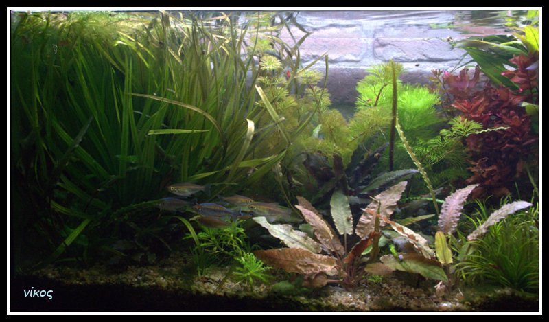 Πρωτοστήθηκε στα μέσα Σεπτεμβρίου του 2008, πέρασε όλες τις περιπέτειες που του υπέβαλα ως αρχάριος, και έφτασε τελικά σε ένα σημείο που κάπως ισορρόπησε (οι άλγες είναι ακόμα ορατές). Στην μέχρι τώρα προσπάθεια, ο στόχος δεν ήταν τόσο το αισθητικό αποτέλεσμα, όσο να μπορέσω να κατανοήσω όσο μπορώ κάποιες διεργασίες και να έχω υγιή ψάρια και φυτά. Οι παρατηρήσεις σας πιστεύω θα βελτιώσουν περισσότερο την κατάσταση. Πληροφορίες Διαστάσεις: 100x30x40 Όγκος: 120 lt μικτά Κατηγορία: κοινωνικό φυτεμένο Φυτά: Alternanthera sessilis, Cabomba caroliniana, Ceratophyllum demersum, Ceratopteris thalictroides, Cryptocoryne wendtii brown, Echinodorus horizontalis, Echinodorus quadricostatus, Echinodorus tenellus, Egeria densa, Hydrocotyle leucocephala, Ηygropyla corymbosa var angustifolia, Hygropyla polysperma, Lilaeopsis novae-zelandie, Limnophila aromatica, Ludwigia repens, Micranthemum umbrosum, Myriophyllum aquaticum, Nymphaea lotus var rubra, Rotala macrandra, Valisneria spiralis small, Valisneria americana Ψάρια / ¶λλα είδη: Trichogaster trichopterus (three spot gourami, 1m+1f), Trichogaster trichopterus (golden gourami, 1m+1f), Trichogaster leeri (pearl gourami, 1m+2f),Beta splenders 1m, 5 SAE, 1 golden molly (βρέθηκε κατά τύχη και θα παραμείνει, ενώ τα υπόλοιπα θα μετακινηθούν τους προσεχείς μήνες σε καινούργιο μεγαλύτερο, ασιατικό ), 5 cherry shrimps (τουλάχιστον τόσες αγόρασα και όταν θυμούνται κάπου κάπου εμφανίζονται), 7 apple snails kai πάρα πολλά σαλιγκαράκια επισκέπτες. Διακοσμητικά υλικά: Υπόστρωμα από λεπτό χαλίκι. (χαλίκι, ξύλα κ.λ.π.) Φόντο: - Φωτισμός: 3 Τ8 ( 2 Osram 1 daylight, 1 Fluora, και 1 Sun-Glo) των 30 W η κάθε μία Διάρκεια φωτισμού: 12 ώρες Φιλτράρισμα: Σφουγγάρι, Syporax, κυκλοφορητής 800 lt/h Θερμοστάτης: Pacific 150 W Λίπανση: Flourish 5 ml 2 φορές την εβδομάδα και potasium της Seachem 5 ml κάθε μέρα Παροχή CO2: Ναί με μπουκάλα και pH controller Παράμετροι: pH: 6.9 Γενική σκληρότητα (GH): 8 Ανθρακική σκληρότητα (ΚΗ): 5 Αμμωνία (ΝΗ3): - Νιτρώδη (ΝΟ2): 0 Νιτρικά (ΝΟ3): 30 Αλλαγές νερού: 40 % κάθε εβδομάδα Θερμοκρασία: 26ο C ¶λλες πληροφορίες: Φωτογραφία: |