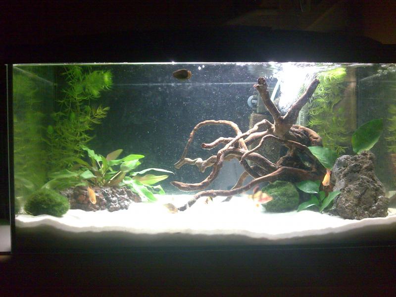 Διαστάσεις:60x30x35 Όγκος:63 μικτα Κατηγορία:κοινωνικο Φυτά:2κερατοφυλλα,2 ανουμπιες,1κρυπτοκορινα,2μπαλακια(?) Ψάρια / ¶λλα είδη:9 tiger barbs,1 e.frenatum,1 platydoras costatus,2corydoras,1σαλιγκαρι Διακοσμητικά υλικά(χαλίκι, ξύλα κ.λ.π.):χαλαζιακη λευκη αμμος,1 ριζα,2 πετρες λαβας(κοκκινη-μαυρη) Φόντο:- Φωτισμός:2x11watt με πατεντα Διάρκεια φωτισμού:12 ωρες Φιλτράρισμα:εσωτερικο 400l/h Θερμοστάτης:50watt Λίπανση:flourish της seachem Παροχή CO2:οχι Παράμετροι: pH:7,3 Γενική σκληρότητα (GH):περιπου 10 Ανθρακική σκληρότητα (ΚΗ):περιπου 12 Αμμωνία (ΝΗ3):0 Νιτρώδη (ΝΟ2):0 Νιτρικά (ΝΟ3):10 Αλλαγές νερού:1 φορα τη βδομαδα Θερμοκρασία:25 Ολα τα σχολια ειναι δεκτα.Το ξεκινησα πολυ λαθος και προσπαθω μεσα απ το gab και τις υποδειξεις σας να το βελτιωσω.Σορρυ για τις φωτογραφιες ειναι απο κινητο. |