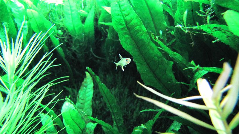 Και ξαφνικά εχθές το βράδυ πήρε το μάτι μου μια κίνηση σε σκιερό σημείο του ενυδρείου. Γαρίδα; σκέφτηκα, η κίνηση όμως δεν ταίριαζε στο "προφίλ". Σηκώνομαι και πάω κοντά. Δεν πίστευα στα μάτια μου, ήταν ένα μικρό lemon tetra( Hyphessobrycon pulchripinnis), γόνος από τα πέντε κομμάτια που μπήκαν σχετικά πρόσφατα στο ενυδρείο. Το ψαράκι είναι περί το 1 εκατοστό στο μήκος, πλήρως σχηματισμένο(αμέσως καταλαβαίνεις τι είναι). Τα κατάφερε να επιβιώσει χωρίς την βοήθεια κανενός, πλην της μαμάς φύσης (παρόλο το κλειστό σύστημα ενός ενυδρείου). Σήμερα με χίλια ζόρια κατάφερα να του πάρω μια πόζα την οποία και σας παρουσιάζω
