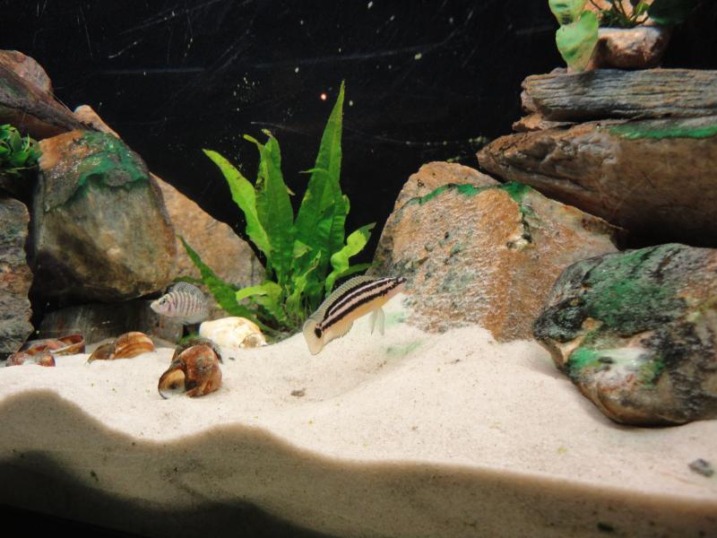 Προστεθηκαν 2 ακομα similis (full size) στα 3 μικρα που προυπηρχαν. απο τη στιγμη που μπηκαν τα 3 μικρα ενω ηταν το καθενα στο χωρο του , τωρα παιζουν και κινουνται ολα μαζι μαζι με τα μεγαλα. δειχνουν τελεια τωρα. Επισης προστεθηκαν 3 νεαροι white pearl kalvus . Ελπιζω να βγει ζευγος. ο ενας εχει σπιτωθει στο ενα απο τα 3 μεγαλα οστρακα. οι αλλοι ειναι μεσα στις πετρες και ειναι δειλοι ακομα. τα leleupi ειναι ακομα πολυ μικρα και κρυβονται μεσα στις πετρες. το προβλημα μου ειναι οτι με εξαιρεση τα σιμιλισ το ενυδρειο φαινεται κυριολεκτικα αδειο. απο οτι φαινεται θα αργησω παρα πολυ να βρω cyprichromis. οποτε αρχιζω να ψηνομαι να βαλω και ενα ζευγαρακι julidochromis |