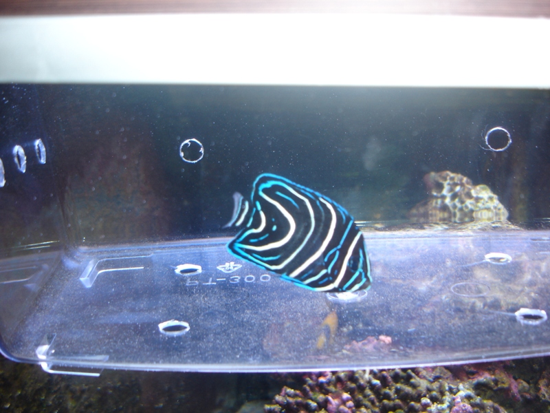 μετα από μια βδομαδα σε καραντινα για να δουμε πως θα παει διατροφικά και εφοσον διαπίστωσα ότι τρωει τα παντα τον εβαλα εντος του ενυδρειου σε ασφαλες προς το παρον καταφυγιο στο οποιο λεω να τον κρατησω καμια βδομαδα ηδη αρχιζουν να τον συνηθίζουν μετα από δυο μερες στο σημειο εκείνο ελπιζω η συμπεριφορά τους να μην αλλάξει μετα ο κυριος είναι ο Koran Angelfish (Pomacanthus semicirculatus) |
