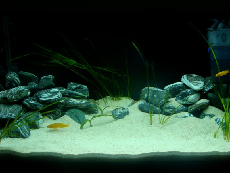 Όγκος: 140 λίτρα καθαρά Κατηγορία: Tanganyika Φυτά: Vallisneria, Crinum thaianum Ψάρια:1 ζευγάρι Neolamprologus leleupi (Orange) «Κλεόβουλε ευχαριστώ» Διακοσμητικά υλικά: αραγωνίτη καιπέτρες Φόντο: βαμμένο μαύρο Φωτισμός: 2χ18watt Διάρκεια φωτισμού: 8ώρες Φιλτράρισμα: fluval 300 1000l/h και 1 εσωτερικό φίλτρο το οποίο θα φύγει. Θερμοστάτης: 150W Λίπανση:όχι Παροχή CO2:όχι Παράμετροι: pH: 8,2 Γενική σκληρότητα (GH): 15 Ανθρακική σκληρότητα (ΚΗ): 12 Αμμωνία (ΝΗ3): 0 Νιτρώδη (ΝΟ2): 0 Νιτρικά (ΝΟ3): 10 Αλλαγές νερού: 25% κάθε βδομάδα Θερμοκρασία: 26 ¶λλες πληροφορίες: Φωτογραφία: