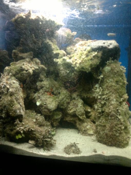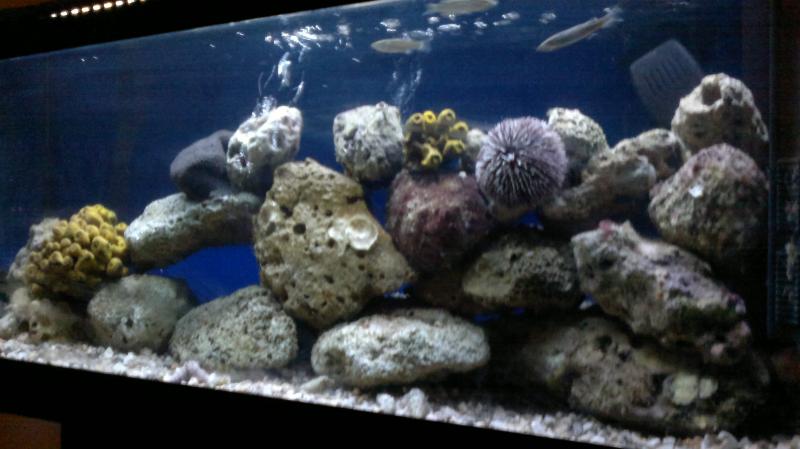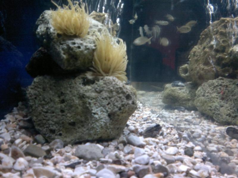 Ο βράχος που έχεις βάλει δεν είναι και ότι καλύτερο. Ψάξε να βρεις τραγάνες (υπάρχουν εκεί που ξεψαρίζουν τα δυχτιάρικα. Για υπόστρωμα καλό θα ήταν να έβαζες ψόφιο αραγωνίτη. Τα ψάρια καλό θα ήταν να τα γυρίσεις πίσω στη θάλασσα και να βάλεις για αρχή ένα μικρό. Καμιά σαλιάρα π.χ. Όχι στις πολλές ανεμώνες, μόνο μία. Τρώνε αρκετά και «βρωμίζουν» το ενυδρείο και αν κάποια ψοφήσει, τέλος όλα…