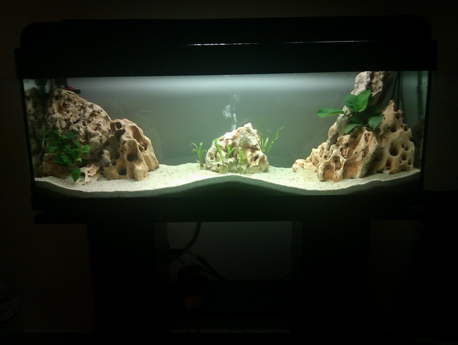 Μερικές παρατηρήσεις : Επειδή έχεις 1 είδος πετρόψαρα & 1 είδος κοχυλόψαρα θα έλεγα να διαμορφώσεις 2 αντίστοιχες περιοχές (από τη μιά μεριά τις πέτρες κι απ' την άλλη ο χώρος για τα κοχύλια [βάλε κι άλλα]) και ανάμεσα τους μια συστάδα βαλισνέριες να ορίζουν και το οπτικό πεδίο τους. Οι πέτρες σου είναι πολύ μεγάλες(σπάστες αν μπορείς 8- ώρες φωτισμού αρκούν. Καλή συνέχεια (και να προσέχεις τα μωρά μου )