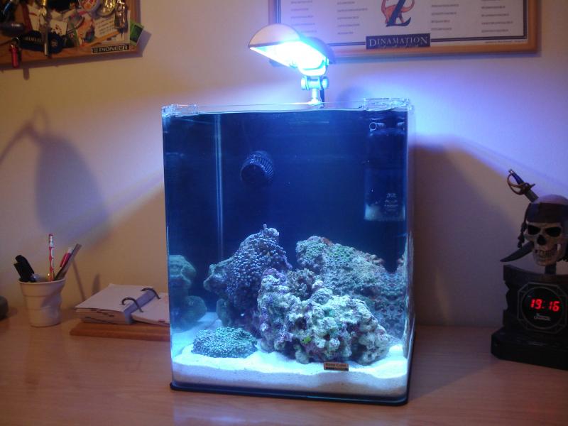 Διαστάσεις:30x30x30 (ο κλασσικος κυβος της dennerle). Όγκος:30l. Κατηγορία:nano reef. Ψάρια / Άλλα είδη:Τιποτα ακομα,οποια προσθηκη θα γινει μετα απο ενα διμηνο. Διακοσμητικά υλικά: 4 κιλα αραγωνιτης μπεζ. Φόντο:Μαυρο Φωτισμός: Dennerle nano marinus blue/white 11 watts Διάρκεια φωτισμού:Απολυτη συσκοτιση. Φιλτράρισμα: 3 κιλα ζωντανος βραχος και αντιφωσφορος-ενεργος ανθρακας της seachem,μεσα σε φιλτρακι. Θερμοστάτης:Οχι ακομα. Παράμετροι: pH:8 Γενική σκληρότητα (GH):Δεν ξερω. Ανθρακική σκληρότητα (ΚΗ):Δεν ξερω. Αμμωνία (ΝΗ3):0,25 Νιτρώδη (ΝΟ2):0 Νιτρικά (ΝΟ3):0 Αλλαγές νερού:Ακομα καμια. Θερμοκρασία:27 celsius Άλλες πληροφορίες:κυκλοφορητης hydor korallia nano 1600,θερμομετρο υδραργυρου sera,υγρα τεστ της api-sera,αλατι red shea,αντιχλωριο seachem prime,χρονοδιακοπτης,κουβαδες προετοιμασιες νερου 5 λιτρων. Σας ακουω... |
