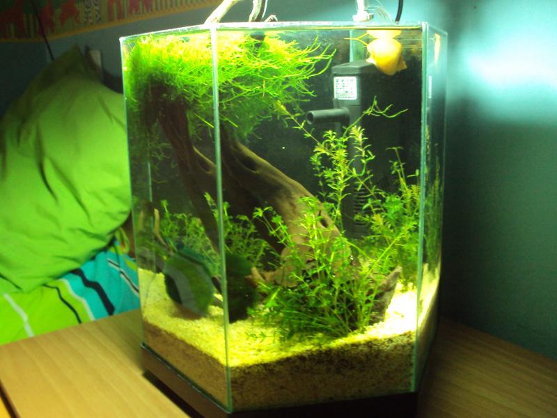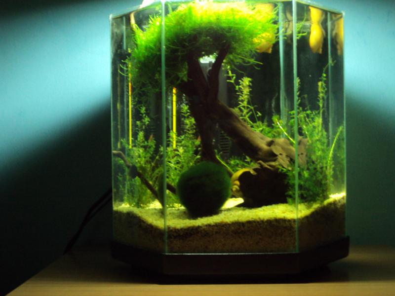Διαστασεις:Δεν μπόρεσα να το μετρήσω λόγω του εξάγωνου σχήματός του,υπολόγισα τον όγκο του γεμίζοντας το χωρίς τίποτα μέσα και βγήκε λίγο παραπάνω από 16 λιτρα Λιτρα:16 Χρονος λειτουργιας: 3,5 μήνες Ρουτινα-αλλαγες νερου:40% κάθε εβδομάδα Φωτισμος:11 watt dennerle για nano 7 ώρες την ημέρα Φιλτρανση:εσωτερικό φίλτρο 600l/hour Θερμοκρασια:24 Διακοσμητικα υλικα: 1 ρίζα Red Moor Βυθος και υποστρωμα:ψιλό χαλαζιακό χαλικάκι μπεζ χρώματος Λιπανση:Seachem flourish καμιά φορά ΡΗ:7,2 Gh:15 Kh:10 Νο2:0 Νο3:10 Λιστα φυτων:Egeria Densa Nano,jawa moss,cladophora aegagrophila ball Λιστα ψαριων και ασπονδυλων:Red Cherry Shrimps,Apple Snails,Zebra Nerite Snail |