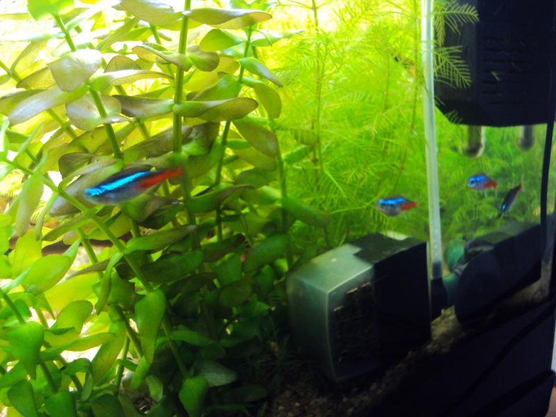 Ογκος... 115, 85 λιτρα καθαρα Φυτα... echinodorus red special,myriophyllum mattogrossense,bacopa caroliniana Ψαρια... 6 x zebra danio, 6 x paracheirodon innesi, 8 x gymocorymbus sp, poecilia reticulata (2 male 3 female) Φωτισμος... 2χ18w philips aquarelle 10.000 k Διαρκεια φωτισμου... 11,5 ωρες Φιλτραρισμα... sera fil 60 (380lt/h) με μαυρα σφουγγαρακια Θερμοστατης... 100w thermal Λιπανση... flourish,flourish exel,flourish tablet Παροχη CO2... ζαχαρη με μαγια, 2 μπουκαλια του 1,5 λιτρων που εναλασονται καθε βδομαδα (1 φυσαλιδα/δευτερολεπτο) η διαχυση γινετε με μια μικρη εσωτερικη αντλια Διακοσμητικα... ξυλα mopani red moor,πετρες μη ασβεστολιθικες rainbow, χαλαζιακη αμμος 1-4 χιλιοστα ph: 6.8-7 kh:8 gh:10 nh3:0 no2:0 no3:10 Η μετρησεις ειναι απο υγρα test της api Αλλαγες νερου... καθε 7 μερες το 1/4 (μισο βρυσης/μισο απιονισμενο) Θερμοκρασια... 24 βαθμοι Το ενυδρείο τρέχει 2χρονια, τα ψαρια μπήκαν το σεπτεμβριο εκτος απο τα γκαπι τα οποια μου ειχαν μεινει απο γεννα και μετα απο ενα μηνα τα εντοπισα. μεχρι το καλοκαιρι ειχα γκαπακια αλλα τα ειχα δωσει πισω στο μαγαζι που τα πηρα. Τα φυτα που εχω τωρα τα εβαλα το νοεμβριο. |