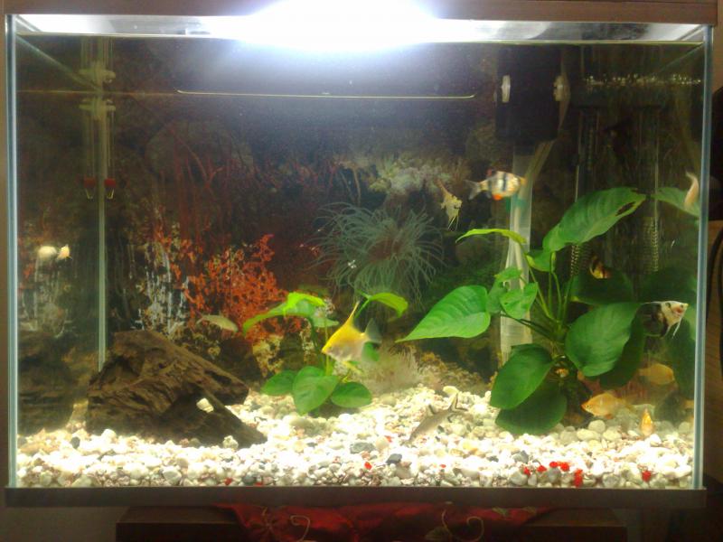 Καλώς ήρθες.Το ενυδρείο σου έχει τεράστια περιθώρια βελτίωσης και θα το καταφέρεις διαβάζοντας.Πρέπει να ξανακοιτάξεις λίγο την ψαροσύνθεσή σου.Τα καρχαριάκια θα γίνουν μεγάλα για το ενυδρείο σου και είναι πολύ γρήγοροι κολυμβητές.Έχεις ψάρια που δεν είναι συμβατά μεταξύ τους,αλλά σιγά-σιγά όλα θα διορθωθούν.Μπορείς να διαβάσεις τα υπομνήματα για αρχάριους γλυκού νερού που θα σε βοηθήσουν πολύ.Αυτό στη μέση που μοιάζει με ανεμώνη τι είναι,γιατί από τη φωτό δεν μπορώ να καταλάβω.Και κάτι ακόμα:σιγουρέψου ότι το ενυδρείο πατάει καλά πάνω στο έπιπλο και λάβε υπόψην το επιπλέον βάρος από νερό και διακόσμηση που είναι μεγάλο.