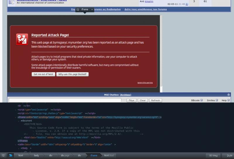 Όπως έγραψα και στο άλλο θέμα, υπάρχει ένα iframe που οδηγεί σε μια σελίδα που έχει αναφερθεί στη google ως κακόβουλη. Ο firefox τo μπλοκάρει επίσης, αλλά μόνο το iframe. Βάζω και screenshots, μια με το iframe όπως είναι κανονικά και μια που το μεγάλωσα για να φανεί το μήνυμα που βγάζει. Τώρα τι παίζει με το iframe και αν πρέπει να υπάρχει εκεί δε το ξέρω... Με firefox πάντως είσαι εντάξει αφού και στο φόρουμ μπορείς να μπεις, και μπλοκάρει την "κακόβουλη" σελίδα.
