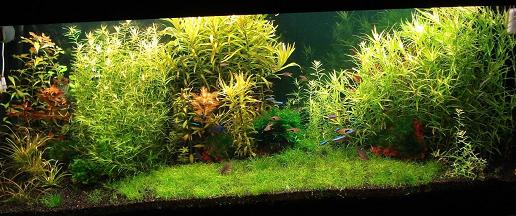 Διαστάσεις : 1.20 Χ 0.41Χ.55 Όγκος :240 λίτρα Κατηγορία :Φυτεμένο ενυδρείο κοινωνικό Φυτά : Echinodorus bleheri, Eleocharis parvula, Echinodorus Ozelot, microsorium pteropus, Anubias barteri nana, Anubias barteri, Lilaeopsis brasiliensis, Rotala sp. ''green'', Rotala rotundifolia , Heteranthera zosterifolia, Nesaea crassicaulis Ψάρια / ¶λλα είδη:6 ramirezi German blue, 4 ramirezi electric blue, 2 ramirezi gold, 2, angelfish, 20 Paracheirodon axelrodi (cardinal tetra), 5 red Rasbora, 6 corydoras sterbai, 2 apple snail Φόντο:Mαυρο χαρτονι ματ Φωτισμός: 1Χ54 watt ( dennerle amazon day ) διάρκεια 11 ώρες, 2 X54 watt T5 (dennerle Colour plus, dennerle special plant) διάκεια 7 ώρες Φιλτράρισμα: Εσωτερικό Φίλτρο juwel, εξωτερικό φίλτρο dolphin C-1300 Θερμοστάτης:300W juwel Λίπανση:2 ml iron, 5 ml potassium, 5 ml flourish εβδομαδιαία μετα από την αλλαγή νερού.Όλα της Seachem Παροχή CO2:΄Πλήρες σύστημα CO2 (150 Φυσ/λεπτό) Παράμετροι: pH:6,40- 7,00 Γενική σκληρότητα (GH):-Ανθρακική σκληρότητα (ΚΗ):3 Αμμωνία (ΝΗ3):0 Νιτρώδη (ΝΟ2):0 Νιτρικά (ΝΟ3):5-10 Φωσφορικα:0,5 Αλλαγές νερού:1 φορα την εβδομαδα 50 λίτρα Θερμοκρασία:26,5οC ¶λλες πληροφορίες:προετοιμασια νερού σε βαρέλι 60 λιτρων, το ενυδρείο τρέχει εδώ και 4 μήνες Φωτογραφία: |