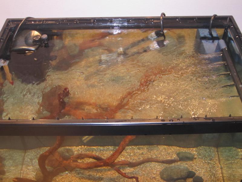Πήρα δεύτερο φίλτρο το elite jet flo 75.Τα δύο φίλτρα πλέον είναι στις 2 άκρες και ο θερμοστάτης στη μέση.Μελλοντικά θα καλυφτούν απο φυτά.Το φίλτρο fluval τώρα τρέχει με σφουγκάρι,άνθρακα απο τις 2 πλευρές και στη μέση siporax mini όσο χωράει.Το Σάββατο βγάζω άνθρακα,αντικαθιστώ με ενυδριακό βαμβάκι και ξεκινάω στρόσιμο.Στο elite που πήρα σήμερα κράτησα το σφουγκάρι που είχε μέσα και το ''έντυσα'' με ενυδριακό βαμβάκι έτσι ώστε να μην υπάρχει κενό και να μην περνάει νερό προς τα πάνω χωρίς να φιλτραριστεί.Αμέσως μετά ένα ολόκληρο διχτάκι siporax και λίγο παραπάνω.Απο πάνω βαμβάκι το οποιό συγκρατείται απο μία σχαρίτσα που έκοψα απο τον άνθρακα που είχε μέσα.Επίσης στο fluval ρύθμισα το νερό να βγαίνει από την χαμηλότρη έξοδο,ενώ την ανατάραξη της επιφάνειας την έχω αφήσει στο elite. Μια ερώτηση τώρα.Το νερό έχει αρχίσει να φαίνεται ψιλο κιτρινο,σα να βγάζει η ρίζα ουσίες και τα σφουγκαρια και βαμβάκι ήδη εχουν κιτρινισει-καφετίσει.Μέχρι πότε θα βγάζει ουσίες?Μήπως να κρατήσω παραπάνω τον άνθρακα?Πότε θα καθαρίσει το νερό? |
