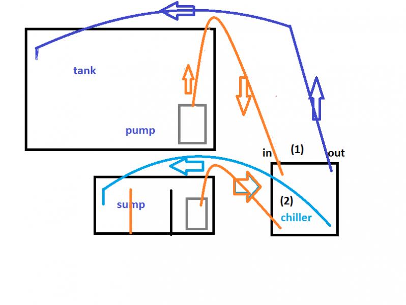 Το τσιλλερ εχει μια εισοδο και μια εξοδο. τοποθετουμε δυο λαστιχα ανεξαρτητα μεταξυ τους(δεν συνδεονται) Στην ΕΙΣΟΔΟ του τσιλλερ συνδεουμε μια αντλια (στο τελος του λαστιχου)με ισχυρο μανομετρικο(γυρω στο δυο) και την τοποθετουμε στο στον πατο του ενυδρειου(1) ή αν εχουμε σαμπ μεσα σε αυτο(2). Την ΕΞΟΔΟ την τοποθετουμε ψηλα στο ενυδρειο(μεσα ομως στο νερο)(1) ή αν εχουμε σαμπ σε αλλο διαμερισμα απο αυτο που εχουμε την αντλια του τσιλλερ(2). Με αυτο τον τρόπο επιτυνχανουμε ροη μεσα στο τσιλλερ (ωστε να μας κρυωσει το νερο)με την βοηθεια τις αντλιας . Ετσι απλα ΥΓ το Νο1 αφορα συνδεσμολογια αποκλειστικα στο ενυδρειο και το Νο2 αφορα την συνδεσμολογια αν εχουμε σαμπ.ΔΕΝ ΓΙΝΟΝΤΑΙ ΚΑΙ ΤΑ ΔΥΟ ΤΑΥΤΟΧΡΟΝΑ Σου εκανα και ενα σχεδιο παρακατω και με τις δυο εκδοχές. Το τσιλλερ εχει και δικο του θερμοστατη και αναβει οποτε πρεπει Επισης ειναι καλο να μην ειναι μεσα στο ντουλαπι, καλυτερα εξω απο αυτο ή και στο μπαλκονι αν γινεται γιατι ειναι ενα μικρο ψυγειο και βγαζει ζεστη!!