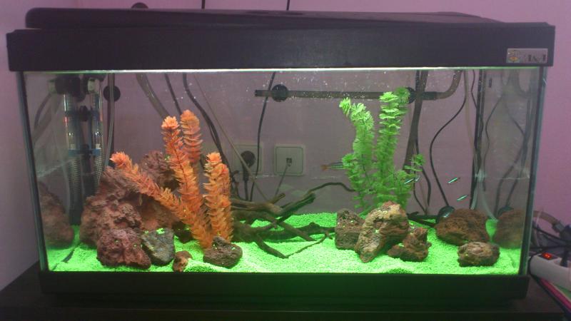 βασικα ειναι αστροτω το ενυδρειο σου αν ισχυουν αυτες η μετρησεις παροτι δεν εχεις γραψει την αμμωνια σου. το χαλικι αυτο θα σου δημιουργηση προβληματα με αλγες προτιμισε κατι φυσικο και οχι φανταχτερο καλυτερα. βαλε ενα φοντο στην πλατη να μην φαινονται τα καλωδια σου και θα δειξει γενικα καλυτερα στο συνολο του . και πετα τα ψευτικα φυτα και απο εκει θα εχεις προβληματα υπαρχουν τοσο ομορφα φυσικα φυτα. και τελος ξεκινα αμεσως διαβασμα στους αρχαριους θελεις πολυ δουλεια φιλε μου .