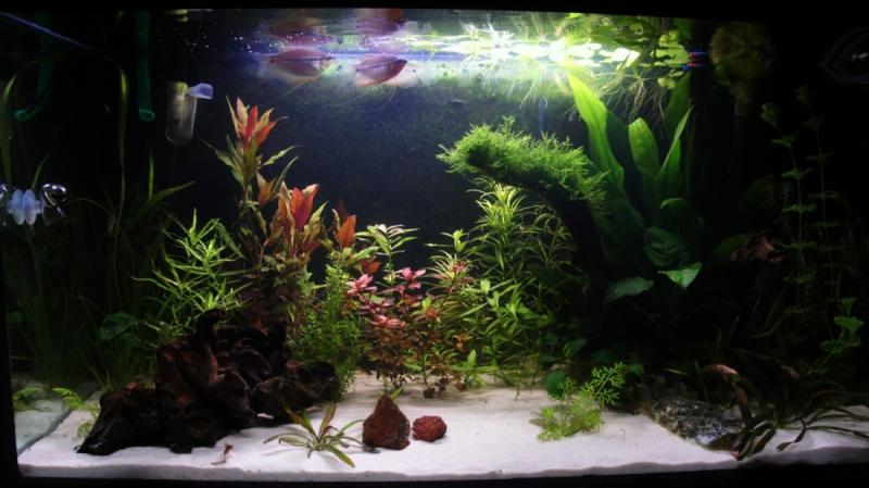 Να πω ότι από την αρχή ξεκίνησα έχοντας αληθινά φυτά (ανούμπιες, βαλισνέριες), αλλά μετά από ένα χρόνο που ασχολούμαι είπα να πάω λίγο παραπέρα. Έτσι αφού αύξησα λίγο τον φωτισμό (1 επιπλέον λάμπα Τ5 24watt) και πρόσθεσα μπουκάλα co2 άρχισα να βάζω πιο απαιτητικά φυτά.