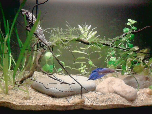 Κατηγορία:Betta Φυτά:Valisneria Americana,Hygrophila polysperma , Rotala macrandra Variegated .lemna minor, moss.. Ψάρια / ¶λλα είδη:betta splender Spade tail , αρκετά trumpet snails Διακοσμητικά υλικά:ρίζα, πέτρες, αμμος Φόντο:- Φωτισμός:Fluorescent light 11 Watt Διάρκεια φωτισμού: 9 ωρες Φιλτράρισμα:3 stage filtration kit (sponge, active carbon and expanded clay) Θερμοστάτης:Scuba Heater 25 Watt Αεραντλία:- Παράμετροι: pH: περίπου 7,2 Γενική σκληρότητα (GH):περίπου 8 dGH Ανθρακική σκληρότητα (ΚΗ):περίπου 10 Αμμωνία (ΝΗ3):0 Νιτρώδη (ΝΟ2):0 Νιτρικά (ΝΟ3):10mg/L Αλλαγές νερού:καθε εβδομμαδα 30% Θερμοκρασία:26 C