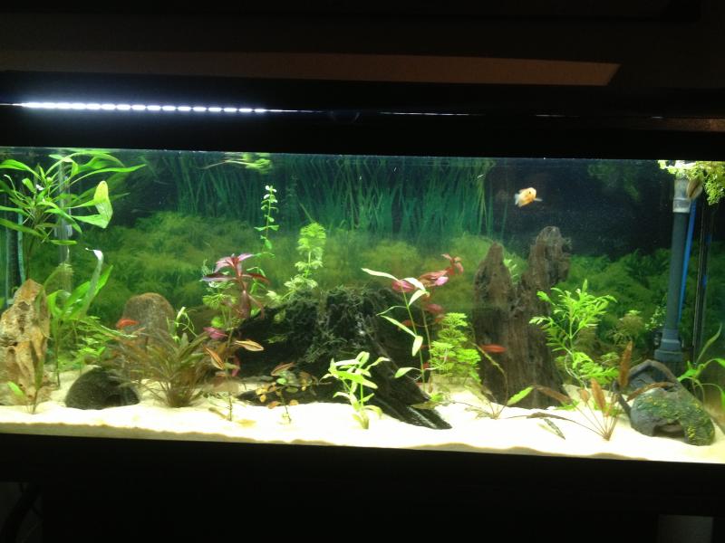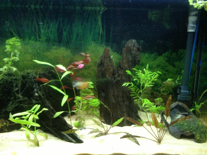 ομορφο και προσεγμενο το ενυδρειο σου ταιριαξε και ομορφα σε κλιμακα το φοντο.. αν βαλεις και σε ομαδες τα φυτα σου ειδικα τα κοκκινα για να μην εχεις αυτη την "αφυσικη " συμμετρια θα γινει πολυ ομορφο..