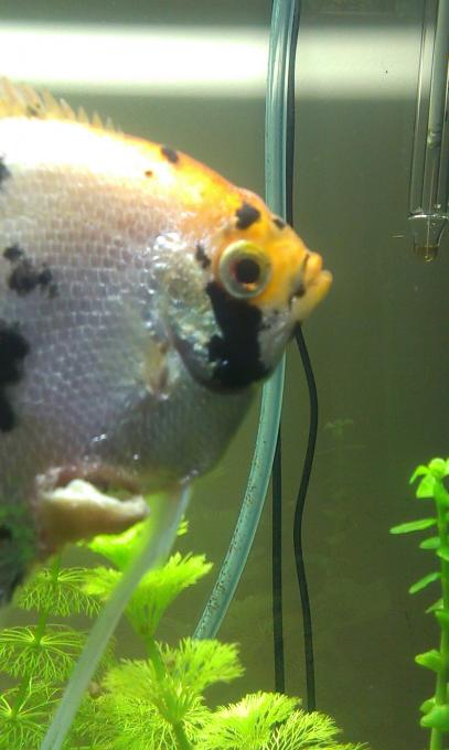 η φωτογραφία είναι αυτή που έχω ανεβάσει. όχι δεν έχει θολομένα μάτια αν παρατηρήσετε προσεχτικά διακρίνεται μία λευκή γραμμή. το ψάρι συνεχίζει να είναι ζωντανο. αλλά επιπλέει δεν κολυμπάει από χτες και στο σημείο που είχε γίνει έτσι το δέρμα του έχει γίνει πλέον σαν ένα στρώμα λευκής βλένας.