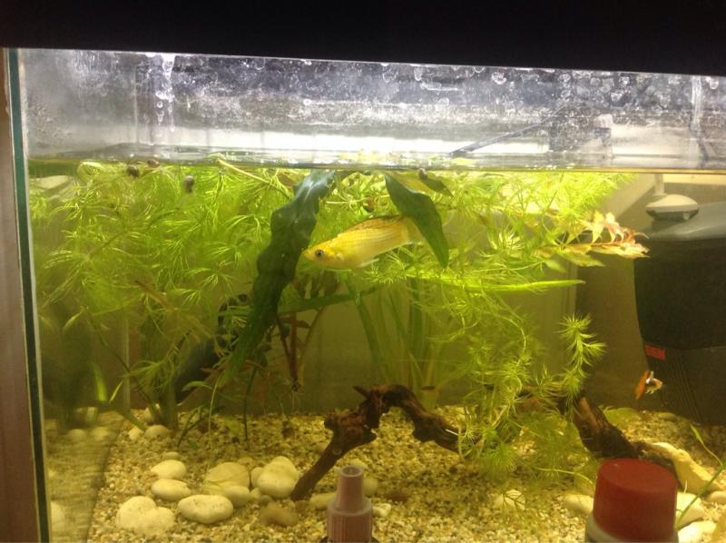Καλησπερα Αν μπορειται να διακρινετε αυτο το μολυ ειναι συνεχεια ψηλα στο ενυδρειο αναμεσα στο κερατοφυλλο( εκει μεσα βρισκονται μωρα απο γεννες)απλα συνηθως αναπνεει ακριβως στην επιφανεια η κρυβεται κατω απο το φιλτρο. Οταν κυκλοφορει στο ενυδρειο δεχετε επιθεση απο το μαυρο μολυ που ειναι στην φωτο με ολα τα αλλα μαζι.εχετε να μου προτεινεται κατι; Μηπως ειναι αρρωστο και πρεπει να το απομονωσω;οι μετρησεις ειναι μια χαρα οι αλλαγες νερου γινονται κανονια. Σκεφτηκα να απομονωσω το μαυρο. Για να δω αντιδραση αλλα θελω την γνωμη σας γτ αν αρχισω να το κυνηγαω με την αποχη τωρα θα ταραξω και τα μικρα. |