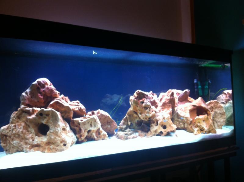 Χαιρετω την παρεα. Φετος αφου μας εκανε τη χαρη η βρυση και δεν εχει νιτρικα, αλλα εξακολουθει να ειναι πολυ σκληρο το νερο, αποφασισα να μετακομισω στην Αφρικη. Μεχρι τωρα μπορω να πω οτι δεν τοχω μετανιωσει καθολου. Ισα ισα ηδη αν και μικρο το χρονικο διαστημα, βλεπω πολυ ωραιες συμπεριφορες. Ενα μεγαλο ευχαριστω θελω να πω στους: Κλεοβουλος, snakepanos, Kostaskich, ignatios, για τις πληροφοριες που μου δωσανε και τη βοηθεια στο στησιμο, καθως και την προμηθεια των πανεμορφων αυτων ψαριων. To ενυδρειο τρεχει εδω και 10 μερες, στρωθηκε με μπολι και τα ψαρια μπηκαν πριν 4 μερες. Ολα βαινουν καλως για την ωρα. Τα ψαρια ειναι μικρα ακομα, παρολαυτα σουλατσαρουν συνεχεια εξω, αλλα και μεσα στα μπολικα περασματα και φωλιες των πετρων.