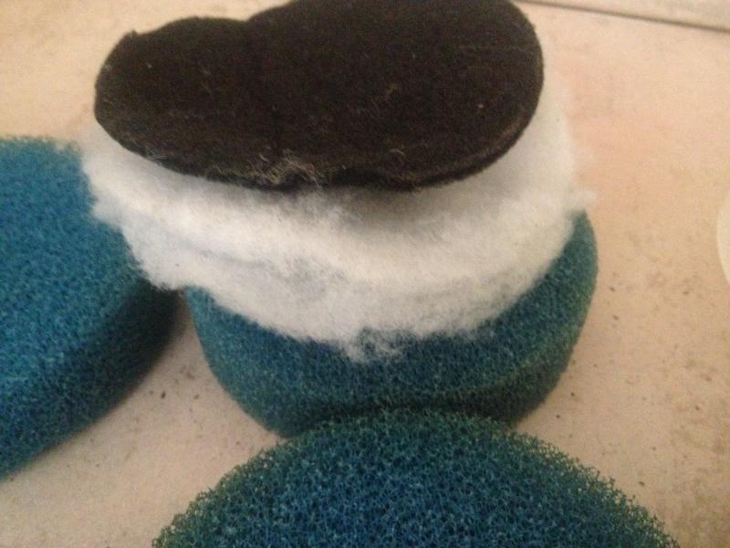Τα μπλε σφουγγαρια εγω θα τα κρατουσα, γιατι φαινονται να ειναι ενταξει. Θα τα επλενα καλα σε καυτο νερο και αν δεν ειναι σε κατασταση που να διαλυονται, νομιζω οτι μπορουν να χρησιμοποιηθουν ξανα. Αν οχι, παιρνεις με το μετρο κοβοντας το, ή ετοιμο. Το μαυρο ειναι ανθρακας και το πετας. Μπορεις να παρεις χυμα και βαζοντας τον σε μια ενυδρειακη καλτσα, να απομακρυνεις οτιδηποτε βλαβερο οταν με το καλο στησεις το ενυδρειο. 2 εβδομαδες νομιζω ειναι αρκετες, μετα τον πετας. Σιγουρα χρειαζεσαι και βιολογικο υλικο (π.χ. siporax), οπως και ενυδρειακο βαμβακι (filter wool), ωστε να το αλλαζεις οποτε κανεις συντηρηση στο φιλτρο. Τα υλικα καλο ειναι να τα τοποθετησεις απο κατω προς τα πανω: -1 μπλε σφουγγαρι -βιολογικο υλικο (καλο ειναι να το βαλεις σε ενυδρειακη καλτσα, ωστε αν χρειαστει να το βγαλεις σε συντηρηση, να γινεται ευκολα) -μια στρωση filter wool