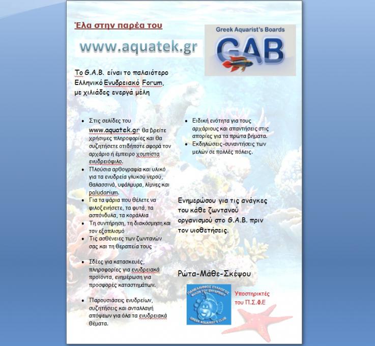Προσωπικα θα επικεντρονομουν περισσοτερο στο "ενημερωσου πριν αγορασεις οτιδηποτε ωστε να φτιαξεις ενα ενυδρειο που θα το χαιρεσαι κι εσυ και οι κατοικοι του" Αυτο μια και προφανεστατα μια τετοια διαφημηση του gab απευθυνεται σε αρκετα μεγαλο ποσοστο σε ανθρωπους που ειναι σε φαση να αποκτησουν ενυδρειο