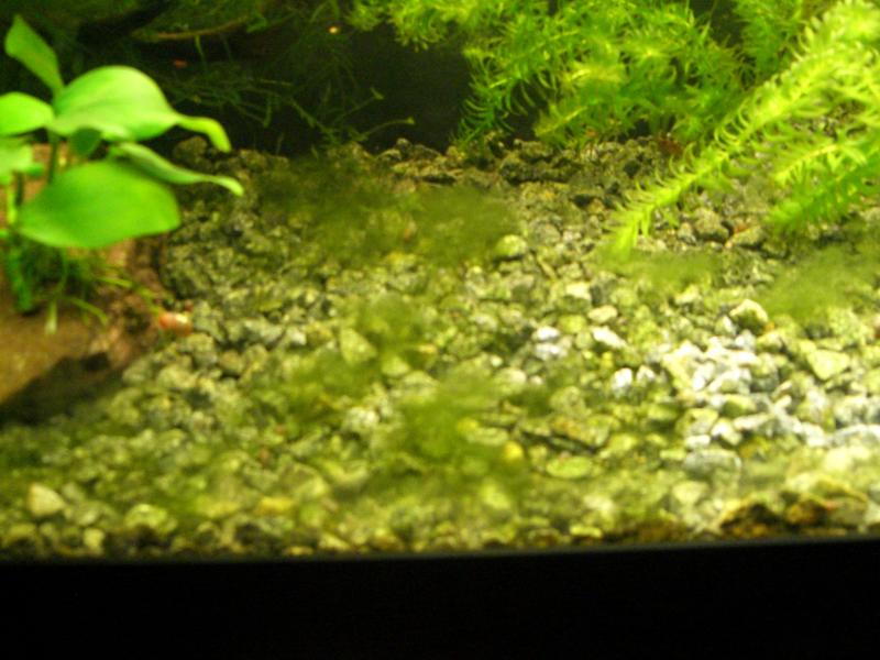 Στο χαλίκι εννοεις οτι δεν ειναι αλγη πρασινη? Βαλε μια γενικη του ενυδρειου και πες ποσα watt εχεις φως?