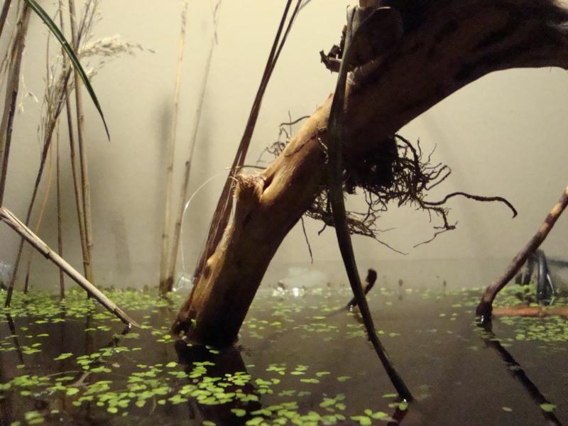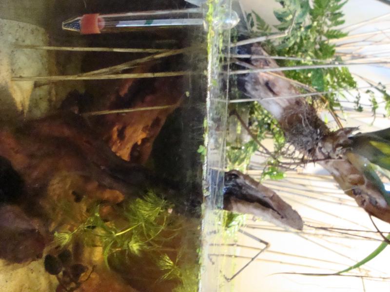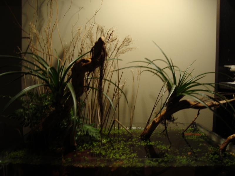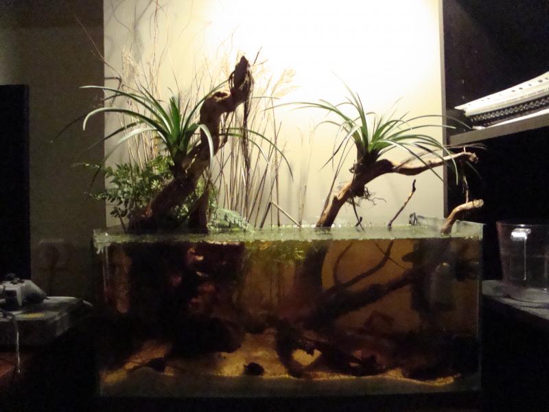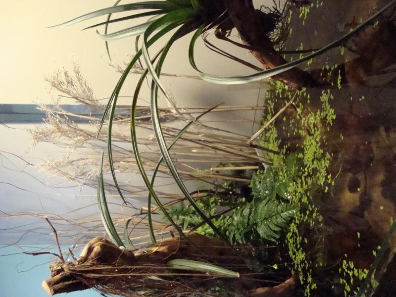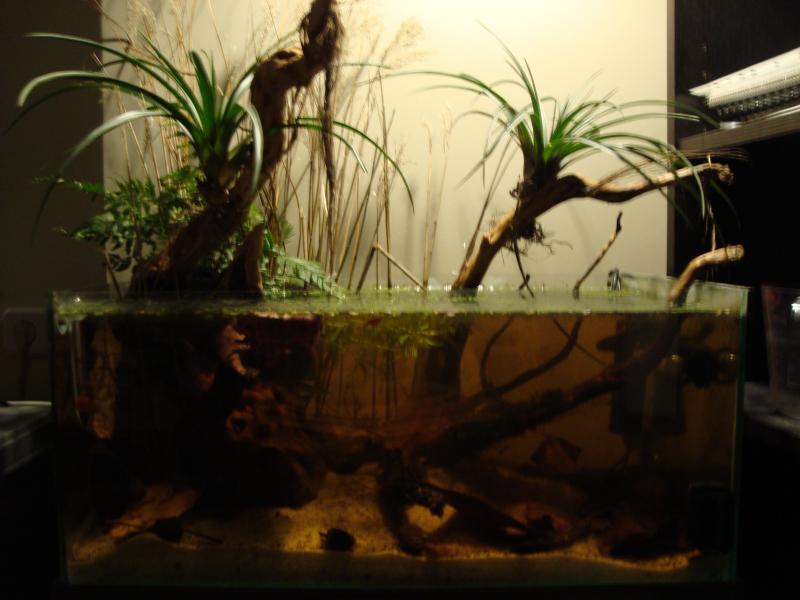 Διαστάσεις: μ55*π35*υ25 Όγκος: 48 λίτρα μικτά Κατηγορία: Riparium,βιότοπος betta.ν.α.Ταϋλάνδη. Φυτά: Στο ενυδρείο, μερικά ριζακια vallisneria,pellia,lemna minnor,Ceratophyllum demersum .Εκτός νερού, ...Tillandsia cyanea, κοινή φτέρη. Ψάρια / ¶λλα είδη: Μια απόχη με τροφή!!!.... Είμαι σε αναζήτηση είδους betta(μέχρι να βρώ,η απόχη θα βγάλει λέπια) Διακοσμητικά υλικά: Ρίζες εμπορίου και πλάτανου,ξερά χόρτα, καλάμια,γένι απο χαμεροπα(ειδος φοίνικα),μπεζ χαλαζιακη άμμος,φύλλα cattapa, alder cones. Φόντο: Δεν έχει. Βοηθάει ο τοίχος που είναι γκρί. Αρχικά είχε μπει καφέ χαρτόνι αλλά λόγο μαύρου νερού δεν φαινόταν τίποτα μέσα στο ενυδρείο. Φωτισμός: "Πειραγμενο" φωτιστικό γραφείου με λάμπα led 20w/220v Διάρκεια φωτισμού: 7,5 ώρες Φιλτράρισμα: εσωτερικό κινεζακι 300l/h. 3w. με spray bar και με κατεύθυνση ροής στο τζάμι. Αυτά μου δίνουν μηδενική ανατάραξη τις επιφάνειας που είναι το ζητούμενο για ενυδρείο betta. Θερμοστάτης: 50w Λίπανση: Ταμπλέτες tetraplant crypto (μια φορά έβαλα για τις βαλισνεριες) και actiplant (σπάνια) για να βοηθήσω λίγο την φακή. Παροχή CO2: όχι Παράμετροι: pH: 7,2 Γενική σκληρότητα (GH): 14 στο βαρέλι αλλαγής,όμως 15 στο ενυδρείο μετα την αλλαγή. Μάλλον οφείλεται στην εξάτμιση και στο συμπλήρωμα που κάνω δυο φορές μεταξύ δύο αλλαγών (τώρα τον χειμώνα.Το καλοκαίρι δε ξέρω τι θ'απογινω ).Τώρα βρήκα αλλη ρουτίνα και την εξηγώ παρακάτω. Ανθρακική σκληρότητα (ΚΗ): 6 Αμμωνία (ΝΗ3): 0 Νιτρώδη (ΝΟ2): 0 Νιτρικά (ΝΟ3): 10 Αλλαγές νερού: 10 λίτρα κάθε εβδομάδα. 9 βγάζω, 10 βάζω. Έτσι συμπληρώνεται το ένα λίτρο (σχεδόν) τις εξάτμισης και κραταω κάπως την ισορροπία στη σκληρότητα Θερμοκρασία: 28°c ¶λλες πληροφορίες: Η γυαλα είναι diy με 5αρι τζάμι χωρίς κόντρες. Τρέχει εδώ και δύο μήνες έτσι όπως είναι.Στο κοντινό μέλλον θα γίνει μια αναβάθμιση,αρκεί να βρω τα υλικά που χρειάζομαι. Το στρώσιμο έγινε με μπολι απο το άλλο ενυδρείο και τροφή σε απόχη(μου πήρε 9 μέρες) την οποία και συνεχιζω για να διατηρω την βιολογία (δεν έχω ψάρι είπαμε). Το δοχείο που φιλοξενεί την φτέρη, ειναι πλαστικο ταπερ και αφου κοπηκε κατάλληλα κολληθηκε με σιλικόνη απευθείας στη γυαλα. Δυσκολεύει τα μερεμετια αλλά δε γινόταν να μπεί με άλλο τρόπο (βεντούζεςκ.λ.π.) Οι τιλλανσιες, είναι επιφυτα αεροφυτα που δεν έχουν ανάγκη κάποιο υπόστρωμα για να καλλιεργηθούν.Έχουν δεθεί με πετονιά απο τις ρίζες τους. Είναι βέβαια εκτός βιότοπου αλλά με αρέσουν και αναπτύσονται καλά. Όλα τα παραπάνω φυτά ψεκαζονται ανά δυο μέρες με νερό βρύσης και μια φορά την εβδομάδα με βρόχινο νερό ενώ η φτέρη ποτίζεται με νερό του ενυδρείου. Τα καλάμια είναι μαζεμένα απο την εθνική οδό (!) και τα κλαδάκια απο άγνωστο φυτό (σε μένα είναι άγνωστο,όχι οτι δεν έχει ανακαλυφθεί ακόμη) Οι μετρήσεις είναι της api. Δεν είναι καλές και καποτε πρεπει να σκεφτω την ΑΟ γιατί με κούρασαν τα βαρέλια και οι προετοιμασίες και παρολαυτά να μην έχω ακριβώς τις τιμές που θέλω.(ή, το γυρνάω σε αφρικάνικο) Λίγη επιείκεια στις κριτικές σας πλιζ