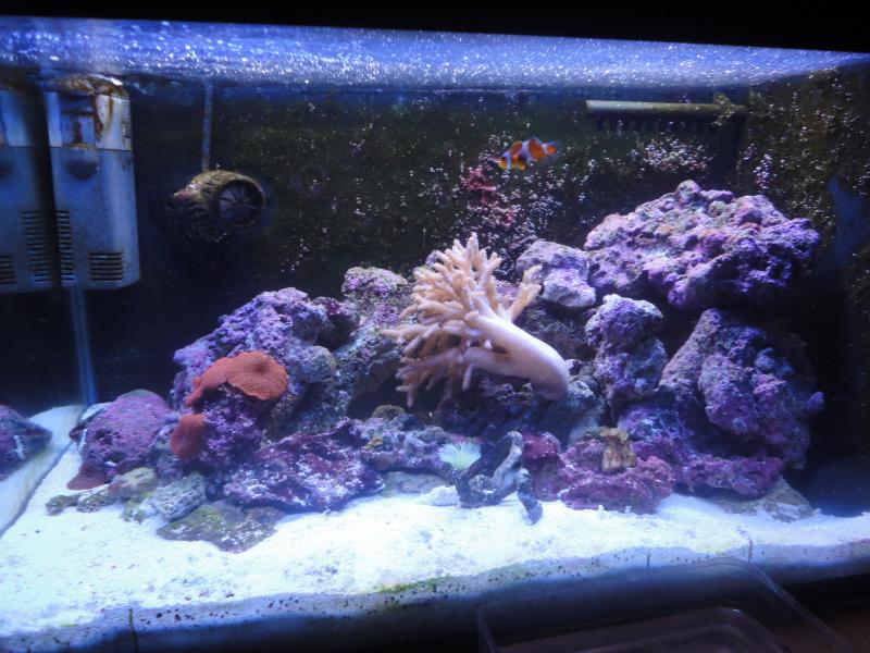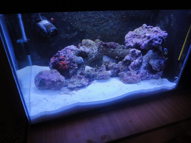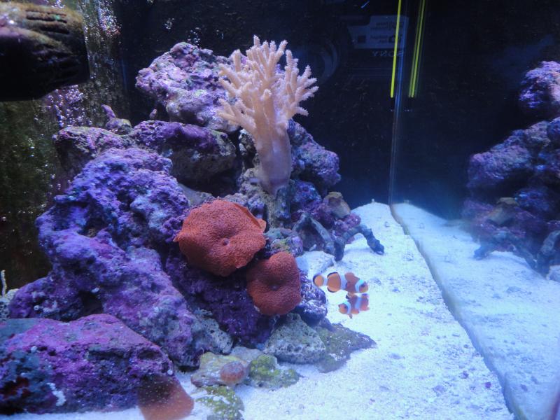 Διαστάσεις:35x35x60 Όγκος:65 Κατηγορία:nano reef. Ψάρια / ¶λλα είδη:2 clown Διακοσμητικά υλικά: 10 κιλα αραγωνιτης Φόντο:Μαυρο Φωτισμός: 2x24w t5 λευκή -μπλε Διάρκεια φωτισμού:9,5 ώρες Φιλτράρισμα: 6 κιλα ζωντανος βραχος και αντιφωσφορος-ενεργος ανθρακας της seachem,μεσα σε φιλτρακι. pH:8 Αλλαγές νερού:10% κάθε 14 μέρες Θερμοκρασία:25 celsius αλατότητα: 1025 ευχαριστώ το φίλο ανδρέα (andreas213) για την καθοδήγηση, βράχο αραγονήτη κ.α, και γιατί όπως με το γλυκό με έπεισε να ξεκινήσω. έχω ένα θεματάκι με τις άλγες στο τζάμι και με κυανοβακτήριο σε κάποια σημεία του βράχου. τα τζάμια πίσω πρεπει να τα καθαρίσω? μερικές φωτό. |