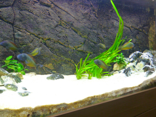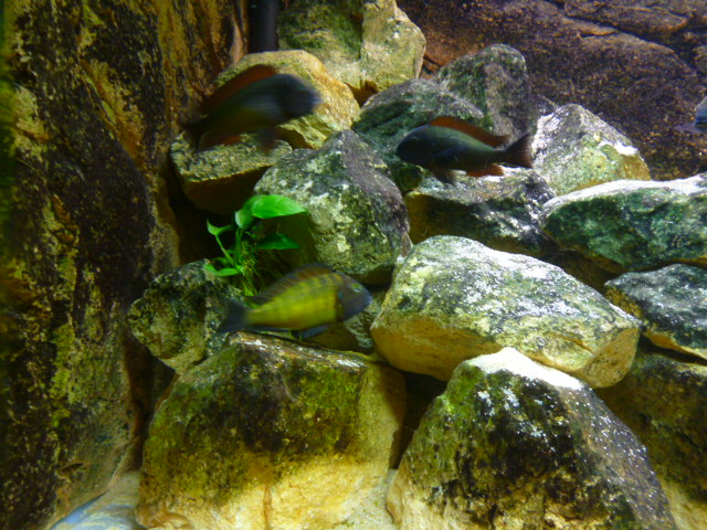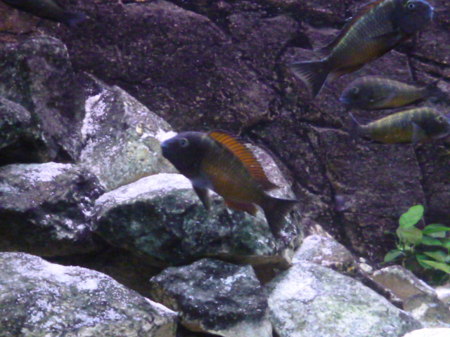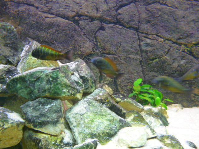 Άρχισαν πλέον να κινούνται και με σβηστά τα φώτα αλλά τρομάζουν εύκολα ακόμα.Σιγά σιγά άρχισαν οι αγάπες κι έρωτες, αγκαλίτσες φιλάκια αλλά και ναυμαχίες σώμα με σώμα εεεεε στόμα με στόμα ήθελα να πω.Οι αρσενικοί κυρίως έχουν μεταφέρει την άμμο από τις μεριές τους πάνω στις πέτρες.Ωραίες συμπεριφορές που μόνο από τα τροφέους μπορείς να τις δεις.Είχα και τα mbuna τόσο καιρό και πολλά είδη μάλιστα αλλά σαν τα τροφέους δεν υπάρχει.