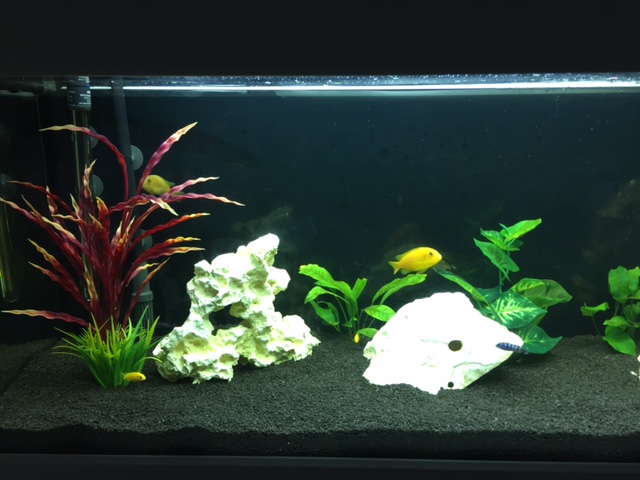τα πλαστικα φυτα και οι τρεις πετρες δεν σου προσφερουν τιποτα.καλο ειναι να προτιμησεις αρκετες πιο στρογγυλεμενες πετρες για στησιμο και μπεζ αμμο.ψαρια μπορεις να βρεις ευκολα φανταζομαι.
