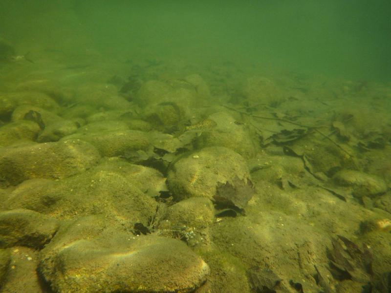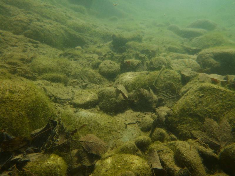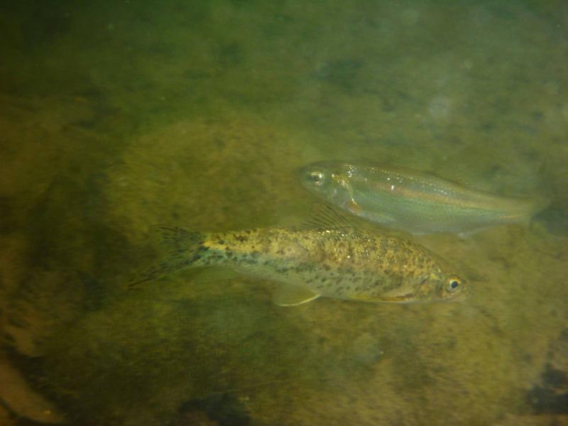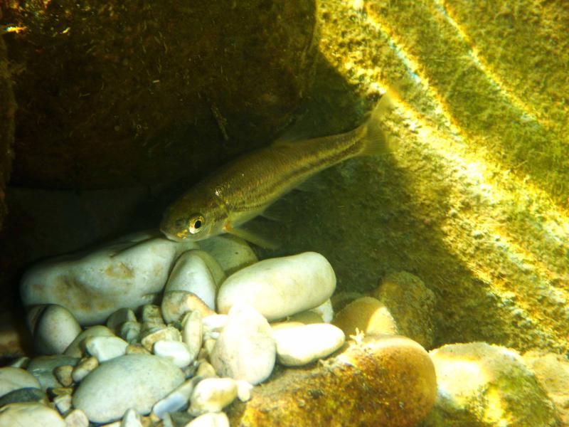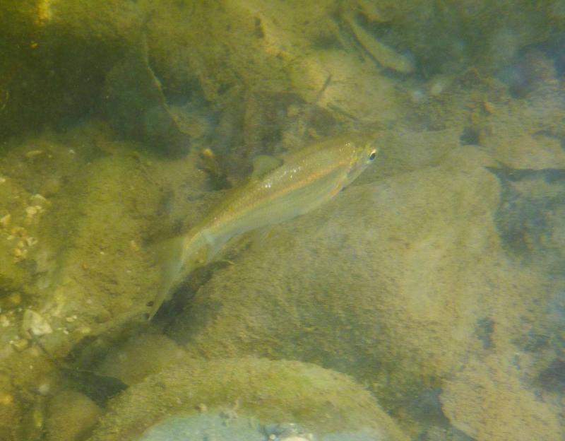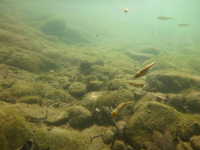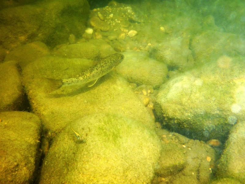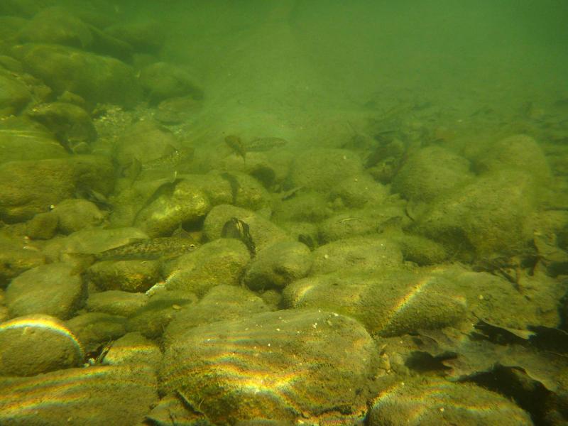 η βουτια στο σημειο που ονομαζεται "πυλες του Αδη". ειδα δυο ειδη αν και σιγουρα υπαρχουν περισσοτερα. περσυ στο ιδιο σημειο οπου η σταθμη του νερου ηταν ψηλοτερα και το νερο πιο κρυο με μεγαλυτερη ροη,ειχα δει και πεστροφες πχ. τα δυο ειδη που ειδα κολυμπουσαν μαζι. αν και το ενα(το πιο μεγαλο) κινουνταν πιο κοντα στο βυθο. ο βιοτοπος αποτελειται απο ποταμισιες πετρες (οι περισσοτερες ασβεστολιθικες),λασπη,ξυλα και φυλλα πλατανου και σκληθρου και αρκετη αλγη.τα ψαρια κινουνταν πολυ στα σημεια με τις πετρες και ειδικα το μεγαλυτερο ειδος απτα δυο τρεφονταν απο τις αλγες πανω τους. η θερμοκρασια του νερου περιπου στους 15 βαθμους με μικρη εως μετρια σχετικα ροη.(δυστυχως δεν ειχα το tds meter μαζι μου τα ψαρια κινουνταν κυριως στα σημεια με τη χαμηλοτερη ροη, ενω ο γονος ερχοταν πανω μου κατα εκατονταδες και με τσιμπαγε πολυ ελαφρα(σχεδον ευχαριστα το βαθος στα σημεια οπου τα ειδα σε μεγαλους αριθμους,απο μισο εως εναμιση περιπου μετρο. |