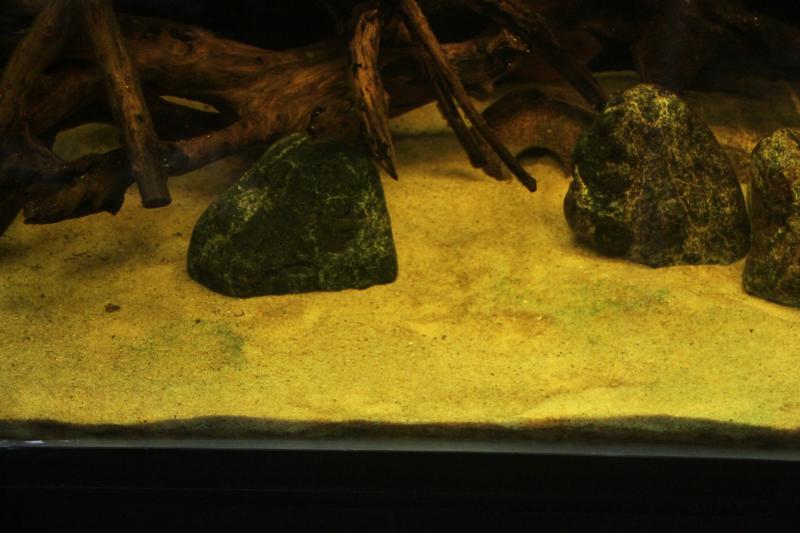 Δεν υπάρχει φιλμ, δεν έχει βγει τόσο πολύ για να δημιουργήσει φιλμ. Είναι σα να εχω μερικούς πράσινους κόκκους άμμου στο βυθό μαζεμενους σε κάποια σημεία. Πριν ένα μήνα είχα αφαιρέσει την άμμο και την έβρασα και μάζεψα αρκετή άμμο, σε βάθος. Δε γλιτώνω με οξυζενέ μόνο.