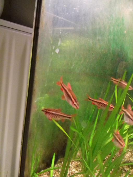 Επίσης στις 23/12/2016 μπήκαν τα 3 από τα 10 cherries ύστερα από παραμονή μιας εβδομάδας σε ενυδρείο καραντίνα. Τα 2 από αυτά που προστέθηκαν ήταν αρσενικά καθώς είχα μόνο θηλυκά. Νομίζω πως η προσθήκη των αρσενικών που άρχισαν να κυνηγούν τα θηλυκά και η προσθήκη της σκάλας έχει στρεσσάρει τα ψάρια καθώς περνούν τον περισσότερο χρόνο μαζεμένα στη μία μεριά του ενυδρείου, την απέναντι από αυτήν που είναι η σκάλα.