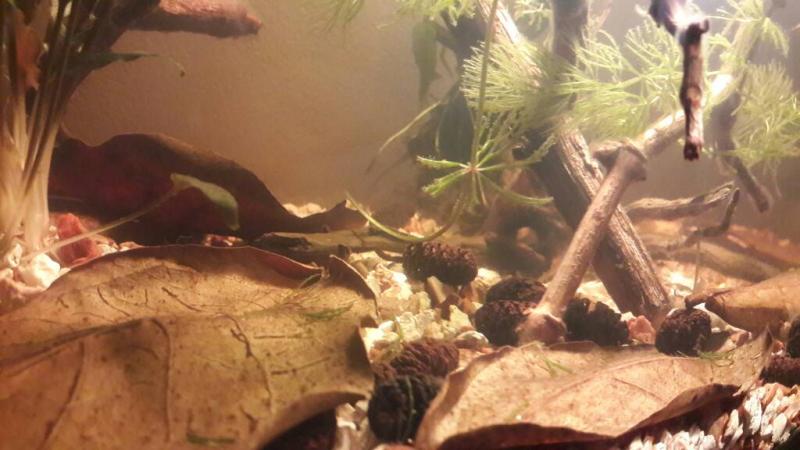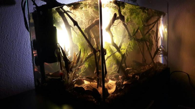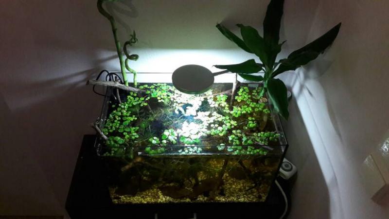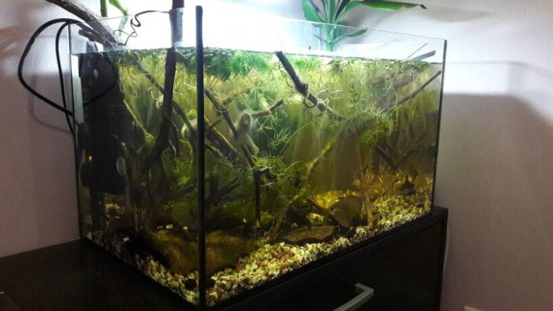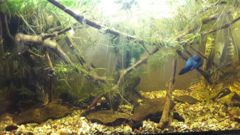 Διαστάσεις:50*30*30 Όγκος:45 λίτρα Κατηγορία: Ασία-Betta Φυτά:Limnobium laevigatum, Cryptocoryne wendtii brown, Ceratophyllum Demersum, Java fern, lucky bamboo, Δράκαινα. Ψάρια / Άλλα είδη: 1x mail betta crowtail. Διάφοροι λαθρεπιβάτες πιθανότατα ramshorn snails. Διακοσμητικά υλικά: χαλίκι, κλαδιά κληματαριάς, φύλλα catappa και alder cones. Φόντο:- Φωτισμός: 3w led Διάρκεια φωτισμού: 8 ώρες Φιλτράρισμα: Εσωτερικό Serra 60 380ltr/hr Θερμοστάτης: 50w Λίπανση:- Παροχή CO2:- Παράμετροι: pH: 7,2 Γενική σκληρότητα (GH): 27 Ανθρακική σκληρότητα (ΚΗ): 15 Αμμωνία (ΝΗ3): 0 Νιτρώδη (ΝΟ2): 0 Νιτρικά (ΝΟ3): 3 Αλλαγές νερού: 10 λίτρα κάθε Κυριακή συν 3 λίτρα συμπλήρωμα κάθε 3 μέρες λόγω εξάτμισης. Θερμοκρασία: 26,5 Άλλες πληροφορίες: Τροφές Hikari, Spirulina flakes και Bloodworms της Ocean Nutrition. Φωτογραφία/Βίντεο: https://www.youtube.com/watch?v=g8rnzRdU09w&t=42s