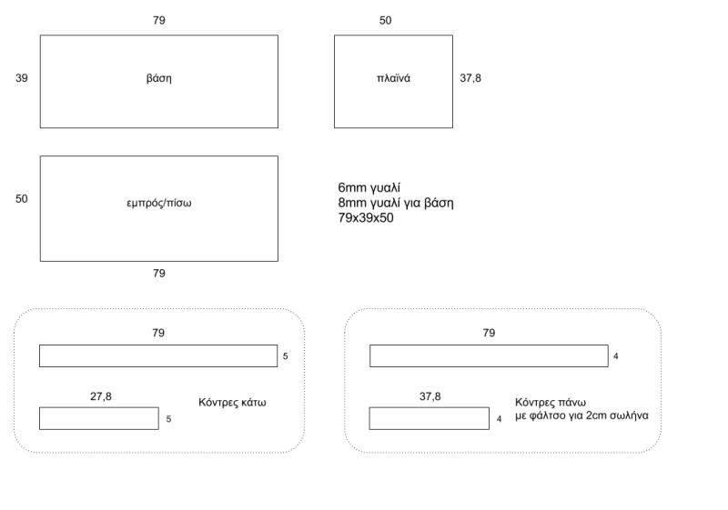 Αλλά τα λίγα που ξέρω αλλά και έχω διαβάσει για αυτό το είδος θέλουν πιο μεγάλα ενυδρεία και το μήκος θα πρέπει να είναι από 1,20 και πάνω Εγώ θα σου πω για τα τεχνικά θέματα. Σε αυτές τις διαστάσεις δεν θα πρότεινα 6αρι τζάμι αλλά 8αρι. Ο υπολογισμός για τις κόντρες είναι λάθος. Οι επάνω και οι κάτω κόντρες κατά μήκος θα πρέπει να έχουν μήκος = (μήκος βάσης) - (πάχος γυαλιού Χ 2) στη περίπτωση σου θα πρέπει να έχουν 79 - (0,6 Χ 2) = 79 - 1,2 = 77,8, κάνε τες όμως 1 χιλιοστό πιο κοντές για να μπει σιλικόνη ανάμεσα Τις κατά πλάτος τις υπολόγισες σωστά, αλλά και αυτές ας είναι 1 χιλιοστό πιο κοντές. Για δες μήπως μπορείς να το κάνεις πιο μεγάλο το ενυδρείο όμως