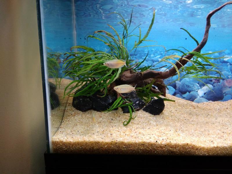 Κατ αρχάς, αφού έστησα ένα diy 35λτ, γλυκάθηκα και με ευκαιρία μια ανακατάταξη του καναπέ στο σαλόνι, είπα γιατί να μην ξαναστήσω και το μεγάλο; Οπότε έφερα το ριο 125λτ απ το πατρικό μου με τη βοήθεια του κουμπάρου μου και ξεκίνησα το διάβασμα… Αρχικά διαπίστωσα ότι ήθελε πολυυυυυύ καθάρισμα γιατί βρισκόταν στην ταράτσα 6 χρόνια εκτεθειμένο στις καιρικές συνθήκες. Εξετάζοντας τα τζάμια του βλέπω στο πλαϊνό μικρό ένα μικρό χτύπημα. Συνεχίζοντας το διάβασμα κατάλαβα πως για να είμαι σίγουρος για τις σιλικόνες του juwel έπρεπε να αφαιρεθούν και να ξανακολληθούν οπότε έτσι και έγινε. Και παραγγέλνω και το μικρό τζαμάκι. Κοιτάζω το μαμά εσωτερικό φίλτρο: σπασμένοι οι κάδοι για τα υλικά. Φτιάχνω νέους από πλαστικό πλέγμα diy. Ο κυκλοφορητής; Εξαφανισμένος, θυμήθηκα μετά ότι είχε καεί . Αναζήτηση νέου και τελικά αγορά hydor 1200lt/h. Εργαστήριο στην ταράτσα: Αφού αφαιρέθηκαν και ξύθηκαν όλες οι επιφάνειες σχολαστικά, ήρθε και η πρώτη ατυχία: Το πρωί βρήκα τα δυο μεγάλα τζάμια σπασμένα στις γωνίες, το πώς έγινε αποτελεί ακόμα μυστήριο. Παραγγελιά λοιπόν άλλα δυο τζάμια στον τζαμά… Κόλλημα, αναμονή 8 ημέρες, γέμισμα, αναμονή 2 μέρες, άδειασμα και μεταφορά στο σπίτι. Και κάπου εδώ κατεβάζω την φαεινή ιδέα να κολλήσω το φίλτρο πίσω αριστερά αντί για πίσω δεξιά που βρίσκεται κανονικά, για αισθητικούς λόγους. Έλα όμως που η αντλία συνδέεται με ένα μικρό πλαστικό της juwel που όταν συνδεθεί αναγκάζει την αντλία να «κοιτάζει» αριστερά! (δηλ προς το τζάμι!) ¶ρα, ξήλωμα του φίλτρου με μακρύ μαχαίρι(η χορδή δεν κάνει δουλειά…) και ξανακόλλημα δεξιά και αναμονή άλλες δυο μέρες. Γέμισμα με άμμο, ξύλα και φυτά και λειτουργία. Το φωτιστικό του μου κάνει κάποια νερά αλλά με εντατικό καθάρισμα στις επαφές του ανάβει. Αγοράζω και μια grolux και για δυο μέρες το χαζεύω και περιμένω απαντήσεις για μπόλι. Ατυχία νο2: Μου καίει την grolux, αγοράζω καινούργια και δεν ανάβει! Κι αρχίζουν να με ζώνουν τα φίδια! Διαβάζω , διαβάζω και καταλαβαίνω ότι μάλλον τα παιξε το φωτιστικό. Φθηνότερη λύση: «εγχείρηση» του μαμα φωτιστικού. Χάρη σε άλλα ποστ στο φόρουμ αλλά και αλλού αντικαταστάθηκε το ballast με νέο της osram (θα ανεβάσω την εγχείρηση στην κατάλληλη κατηγορία) και με μπόλι ξεκίνησε και η έμψυχη λειτουργία του. Επιτέλους μπήκαν και τα πρώτα ψαράκια: 4 μελανοταινίες boesemani |