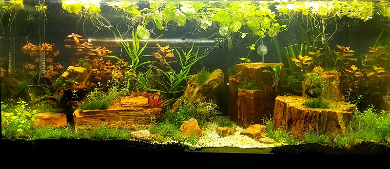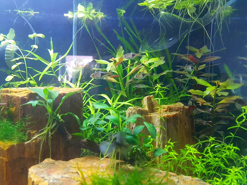 Τίτλος ενυδρείου: ‘Planted Newbie’ Διαστάσεις: 80*30*45 Όγκος: 90 καθαρά Κατηγορία: Φυτεμένο κοινωνικό Χρόνος λειτουργίας: 1 μήνας Φυτά: Στην επιγάνεια: Limnobium laevigatum, Hydrocotyle leucocephala Σε πέτρες ξύλα: Anubia petite, Vesicularia Dubyana (Christmas Moss), Taxiphyllum (Flame moss), Pelia moss Φυτεμένα: Heteranthema zosterifolia (stargrass), Micranthemum Monte Carlo(Εμεινε ελάχιστη μου χάλασε), Eleocharis parvulla, Hemianthus Micronthemoides, Sagittaria Subulata, Alternanthera reineckii mini, Ludwigia mini, Lobelia cardinalis mini, Pogostemon stellatus Octopus, Ludwigia repens rubin, Vallisneria Spirallis Ψάρια / Άλλα είδη: 10 Trigonostigma Heteromorpha, 6 Celestichthys margaritatus,2 Crossocheilus langei (προσωρινά θα πάνε σε κοπαδάκι φίλου) Διακοσμητικά υλικά: Υπόστρωμα Aquaforest Lava soil και Seachem Flurite Black, 3 ρίζες Moorwood και Spiderwood και πέτρες (Σιδερόπετρες Ξυλόπετρες) Φόντο: Αφίσα μαύρη Φωτισμός: Diy φωτιστικό από 1 chihiros A451(27watt 4350lm και 2 Led προβολείς 10watt (6500k 850lm) Διάρκεια φωτισμού: 4 ώρες το Chihiros και 3 ώρες τα προβολάκια παράλληλα με το Chihiros σύνολο 7 (Το cichiros στην 5η από τις 7 σκάλες) Φιλτράρισμα: Dophin Astro 2208 (700 l/h) χοντρό σφουγγάρι siporax ελαφρόπετρα και ενυδρειακό βαμβάκι Θερμοστάτης: 200 watt Λίπανση: όχι ακόμα Co2 και τρόπος διάχυσης: Μπουκάλα 2 kg διάχυση 45 φυσ/λεπτό 24 ώρες Παράμετροι: pH: 7.2 Γενική σκληρότητα (GH): 10 Ανθρακική σκληρότητα (ΚΗ): 8 Αμμωνία (ΝΗ3): 0 Νιτρώδη (ΝΟ2): 0 Νιτρικά (ΝΟ3): 5 Αλλαγές νερού: 30% 2 φορές την εβδομάδα θα γίνει 1 φορά σταδιακά Θερμοκρασία: 24.5-25 με Stc 1000 Άλλες πληροφορίες: Χωρίς καπάκι με ένα Diy πλέγμα. Μετρήσεις με υγρά της Api Γενικά είναι η πρώτη απόπειρα σε ενυδρείο και φυτεμένο κάθε παρατήρηση και συμβουλή δεκτή. Είχα πολλές άλγες μετά τις πρώτες 10 μέρες (Δεν υπήρχε CO2 τότε) έβαλα excel υπερδοσολογία που δεν έκανε κάτι και μετά δοκίμασα Api Algaefix και πραγματικά καθάρισε ειδικά την hair algae που έβγαζα 1 μπολάκι κάθε μέρα με οδοντόβουρτσα. Τώρα μου έχει μείνει κάτι σαν καφέ κόκκους σκόνη πάνω στα φύλλα που αν τα τινάξω φεύγει και μαζεύω με σκούπα συνέχεια. Μία ρίζα έχει βγάλει αυτό το λευκό σαν μούσι διάβασα ότι είναι μήκυτας και θα φύγει. |