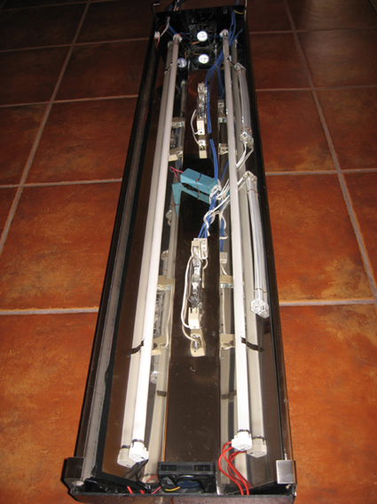 Μετα απο 1 χρονο περιπου λειτουργιας του ενυδρειου με τις Τ5, αποφασισαμε με τον συνηθη υποπτο, τον γιαννη,(accnt) να κατασκευασουμε ενα νεο φωτιστικο με 2χ150 ΜΗ, 2χ54 Τ5, και moonlight.