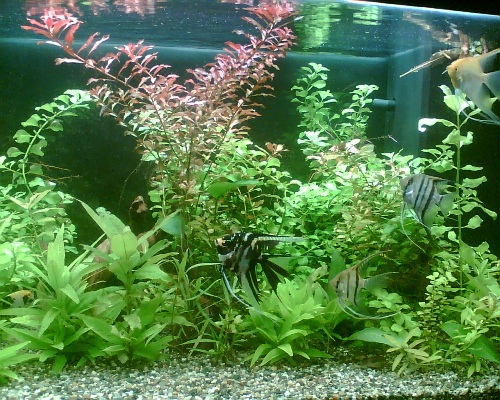 Τα αγγελοψαρα που βλεπω στην 3φωτο ειναι ακριβως ιδια με τα δικα μου!!!Αισθητικα το βρισκω ομορφο.Θα δειξει πολυ περισσοτερο αν καλυψεις σταδιακα το χαλικι μπροστα μπροστα η με καμια ριζουλα ακομα.Επισης σπασε λιγο το πρασινο με κανα κοκκινοπο φυτο.Σε κανα 2μηνο που θα χουν αναπτυχτει κιαλλο τα φυτα θα δειχνει κουκλι!