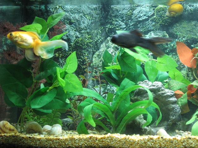 Ωραιο φαινεται.Και αληθινα φυτα να εβαζες θα τα εκαναν μεζεδακι τα ψαρακια σου.Δοκιμασε να βαλεις κανα δυο ανουμπιες οι οποιες ειναι φυτο μηδενικων απαιτησεων απο εσενα.Απλα δεστην σε ενα κορμο ή καπου αλλου και αν εισαι τυχερος θα την δεις να ανθιζει.Και δεν την πειραζουν τα χρυσοψαρα.