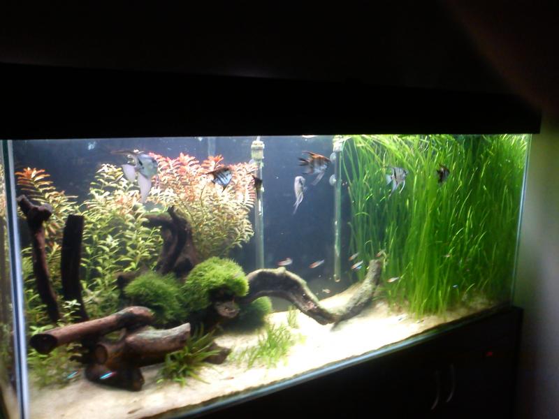 Διαστάσεις: 170 x 55 x 70 Όγκος: 654 Λίτρα Φυτά: βαλισνεριες, κρυπτοκορινες, java moss... Ψάρια / ¶λλα είδη: 7 σκαλαρια, 15 νεον τετρα, 30 ροδοστομοι, antentome helena Διακοσμητικά υλικά: χαλαζιακη αμμος, ριζα απο πλατανο Φόντο: αφισα μαυρη Φωτισμός: 4 x 54 watt (2 daylight - 2 sylvania grolux), μπλε led Διάρκεια φωτισμού: 10 ώρες Διατροφή ψαριών: tetra min menu, tetra min pro crisps, tetra pro colour, tropical supervit, tropical supervit granulat, σκουληκια grindal Φιλτράρισμα: eheim 2078e Θέρμανση: jagger 250watt - jagger 300watt Θερμοκρασία: 26 βαθμοι Ψύξη: 8 ανεμιστηρες xilence red 80mm Λίπανση: seachem flourish, seachem flourish iron Παροχή CO2: Όχι Αλλαγες νερού: 40% μια φορα την εβδομαδα Ταισμα: 3 - 4 φορες την ημερα |
