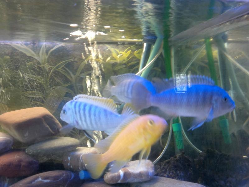 το πρωτο ειναι υβριδιο φουλ τα αλλα 3 ειναι Metriaclima greshakei το μπλε ειναι αρσενικο και τα δυο γκρι θυληκα .