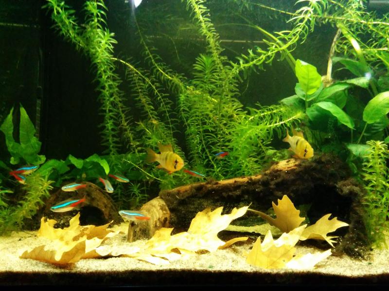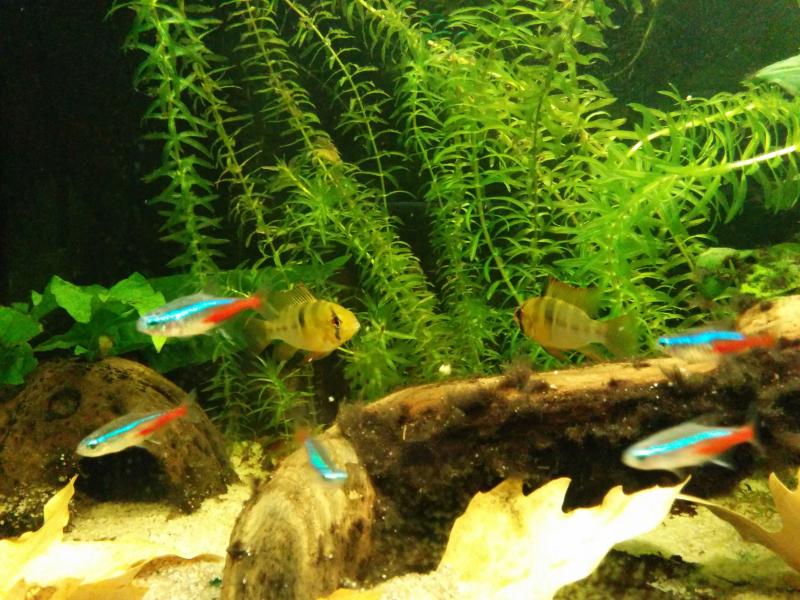 Επίσης, οι οτόκυκλοι είναι ψάρια τα οποία θέλουν να είναι σε κοπάδι πράγμα που σημαίνει ότι πρέπει να είναι 6+ άτομα, οπότε θα μπορούσες να προσθέσεις άλλους 3-4 εφόσον έχεις πολύ καλή φίλτρανση, αν και έχεις ήδη αρκετά ψάρια. Τέλος, τα ραμιρέζι είναι ζευγάρι; Εάν δεν είναι (και είναι 2 θηλυκά ή 2 αρσενικά) τότε θα έχεις πολλά κυνήγια. Και επιπλέον, εάν δεν έχεις ήδη μπορείς να δημιουργήσεις κρυψώνες, κυρίως για τα ραμιρέζι. Εμένα μου αρέσει πολύ το ενυδρείο σου, και ειδικά με τα φύλλα και τις καρύδες του έχεις προσφέρει μία βιοτοπική προσέγγιση και αν κάνεις και τις βελτιώσεις που σου είπα θα έχεις το τέλειο αποτέλεσμα. Καλή συνέχεια
