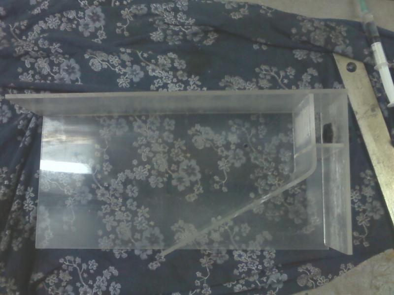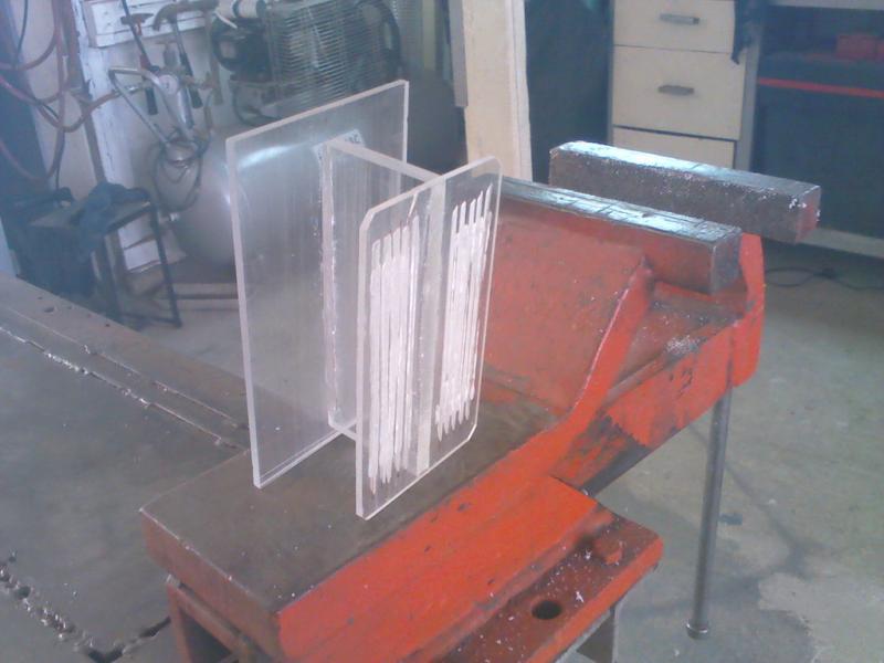 Πείρα κάτι παλιά ρεταλάκια πλέξι γκλας που είχα και ένα αντλιάκι από ένα εσωτερικό φίλτρο και ξεκίνησα. Έκοψα τα κομμάτια με το κοπίδι Πέρασα τα σόκορα στην σβούρα για να είναι εντελώς λείες οι επιφάνειες για κόλλημα. Τρύπησα τον πάτο για να περάσει το στήριγμα της αντλίας Έκοψα μια λωρίδα και αφού την ζέστανα για να της δώσω το σχήμα που πρέπει την έκοψα με το dremel σε μερικά σημεία για να περνά το νερό.