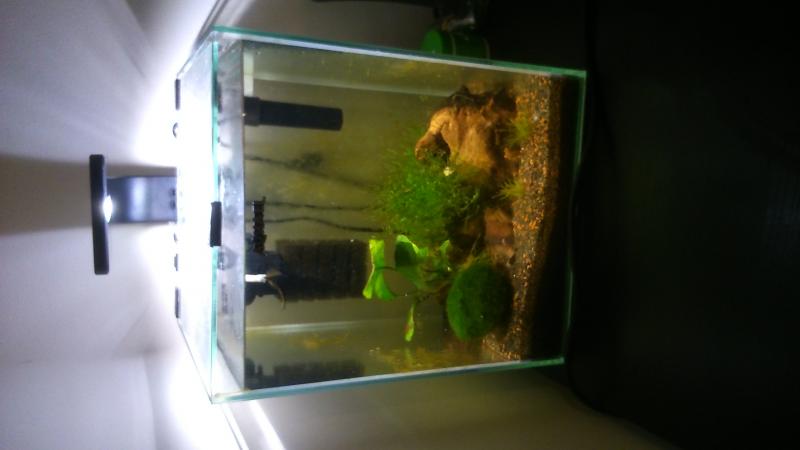 Πληροφορίες Διαστάσεις: 25x25x30 Όγκος: 19 lt Κατηγορία: Δεν γνωρίζω πως να το προσδιορίσω Φυτά: anubia barteri, cladophora aegagrophila, taxiphyllum και eleocharis. Ψάρια / ¶λλα είδη: red cherry (x4) και σαλιγκάρια μη προσδιοριζόμενα για την ώρα Διακοσμητικά υλικά: μοπάνι και ένα χαλίκι - υπόστρωμα που δε θυμάμαι την μάρκα Φόντο: - Φωτισμός: 6 βατ λεντ 8000 K Διάρκεια φωτισμού: 7 ώρες αυτήν την περίοδο Φιλτράρισμα: pat mini filter, 4 W, 400 l/h max., εγώ το έχω στην ελάχιστη ροή και "κοιτάει" προς τα πάνω στην μπροστά δεξιά γωνία. Θερμοστάτης: Heatzone aquael AQSn-10 (εδώ χρειάζομαι λίγη βοήθεια) Λίπανση: - Παροχή CO2: - Παράμετροι: pH: 7,5 Γενική σκληρότητα (GH): - Ανθρακική σκληρότητα (ΚΗ): - Αμμωνία (ΝΗ3): 0 Νιτρώδη (ΝΟ2): 0 Νιτρικά (ΝΟ3): 5-10 Αλλαγές νερού: 4 lt κάθε 7 μέρες Θερμοκρασία: θεωρητικά 25 ¶λλες πληροφορίες: τρέχει περίπου 40 ημέρες Το ζήτημα που αντιμετωπίζω με τη θερμοκρασία (δεν έχω θερμόμετρο) είναι πως δεν ξέρω εάν το συγκεκριμένο θερμαντικό σώμα είναι ανοιχτό ή όχι. Δεν έχει κάποιο σημείο που να μπορείς να το ελέγχεις και επίσης δεν έχει πινακάκι για να επιλέξεις σε ποια θερμοκρασία το θέλεις. Διάβασα στο μπουκλετάκι του να λέει πως δε χρειάζεται και δεν μπορώ να επέμβω στις ρυθμίσεις του. Προσαρμόζει τη θερμοκρασία αυτόματα στους 25. Φυσικά, η αμφιβολία μου έγκειται στο ότι επειδή εδώ και 2-3 μέρες στρώνω και ένα 25λιτρο με θερμοστάτη της aquael στους 25 βαθμούς, το νερό είναι πιο ζεστό και θυμίζει 25 βαθμούς, ενώ ο κύβος είναι κρύος. Οπότε, το ερώτημά μου είναι αν γνωρίζει κάποιος το πως να ενεργοποιήσω το θερμοστάτη του κύβου. Επίσης, παρατηρώ πως η ανούβια έχει κάποια βρώμικα σποτάκια στα φύλλα που βρίσκονται σε απευθείας έκθεση με το λεντ, πως μπορώ να το διορθώσω; Στην ουσία ο λόγος που λειτουργεί 7 ώρες το λεντ είναι για να προστατέψω ( |