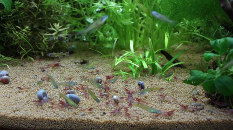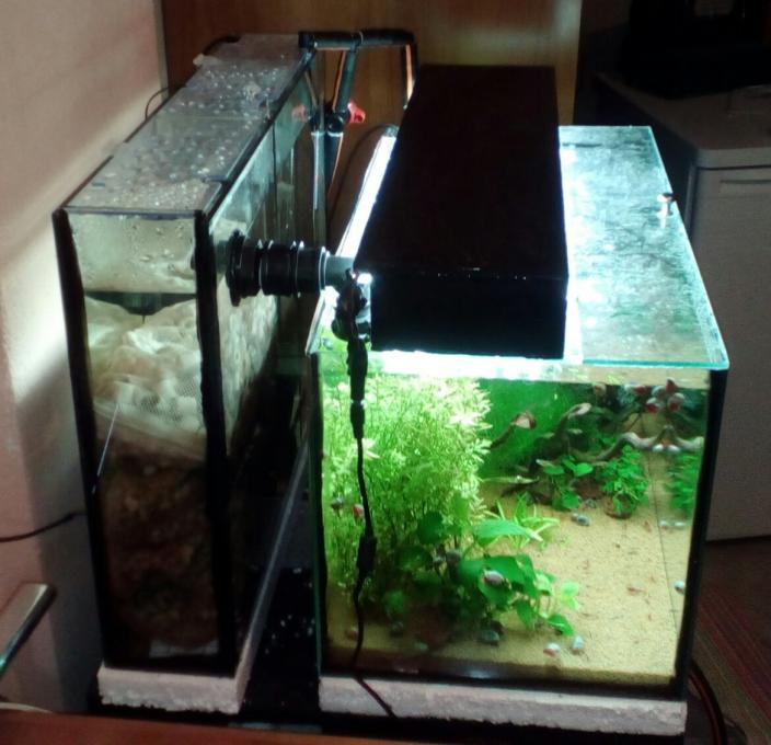 εκλεισαν τα 2 κυβακια και μπηκε στην θεση τους αυτο το ενυδρειο, λογω συντηρησης, μιας κι ετοιμαζω και το χρυσοψαραδικο σε λιγο καιρο(επιτελους). στο ενυδρειο θα προστεθει εν καιρω και μια ομαδα κορυς , αν βρω πυγμαιους, αλλιως panda. το νερο μαλακωνει σταδιακα με ρητινη, με σκοπο να φτασω σ ενα επιπεδο ph κοντα στο 7. Πληροφορίες Διαστάσεις: 60 χ 30 χ 30 Όγκος: 54 L Κατηγορία: κοινωνικο φυτεμενο Φυτά:flame moss,hygrophila difformis,rotala rotundifolia,anubias,java fern,sagittaria subulata,stargrass,cryptocoryne wendtii brown Ψάρια / ¶λλα είδη: 17 pseudomugil gertrudae, red rilli shrimps, ramshorns snails,mts Φόντο: καφε Φωτισμός: 5 μετρα λεντοταινια cool white Διάρκεια φωτισμού: 8 ωρες Φιλτράρισμα: diy κρεμαστο/πισω sump , περιπου 20λιτρα χωρητικοτητας με 5-6 λιτρα ελαφροπετρα...ξεχασα να βγαλω φωτο, καποια στιγμη θα το κανω Θερμοστάτης: 100watt Λίπανση: - Παροχή CO2: - Παράμετροι: pH: δεν ειναι ακομα το τελικο Γενική σκληρότητα (GH):δεν ειναι ακομα το τελικο Ανθρακική σκληρότητα (ΚΗ):δεν ειναι ακομα το τελικο Αμμωνία (ΝΗ3):0 Νιτρώδη (ΝΟ2):0 Νιτρικά (ΝΟ3):10 Αλλαγές νερού: 20 λιτρα / βδομαδα Θερμοκρασία: 24 ¶λλες πληροφορίες: Φωτογραφία: |