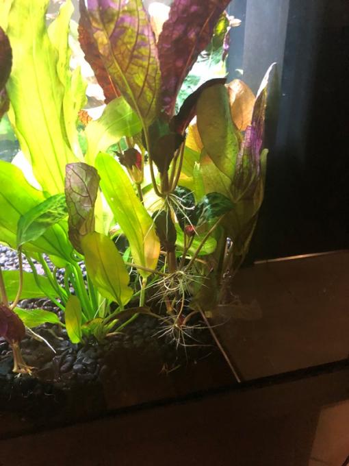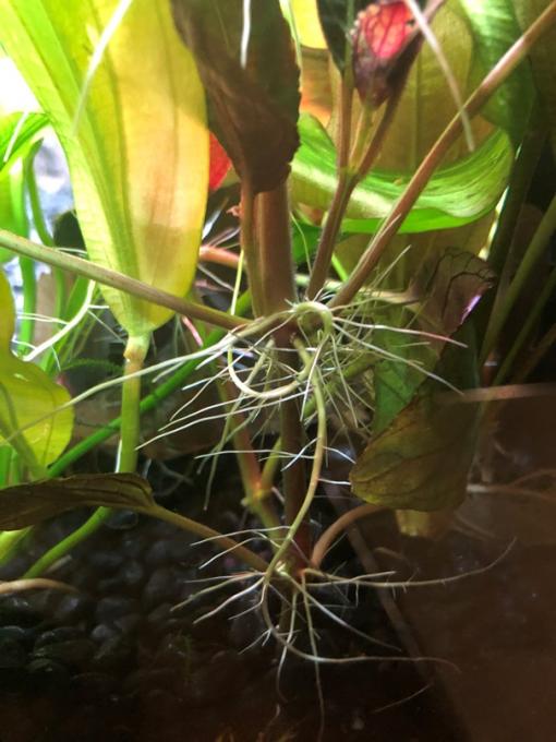 Νομίζω οτι πρόκειται για usteriana και αυτο που φαίνεται ειναι το ριζωμα, οι κρυπτοκορινες δεν βγαζουν εναεριες ριζες, αυτο που πεταει λοιπον επρεπε να ειναι φυτεμενο στο υποστρωμα.